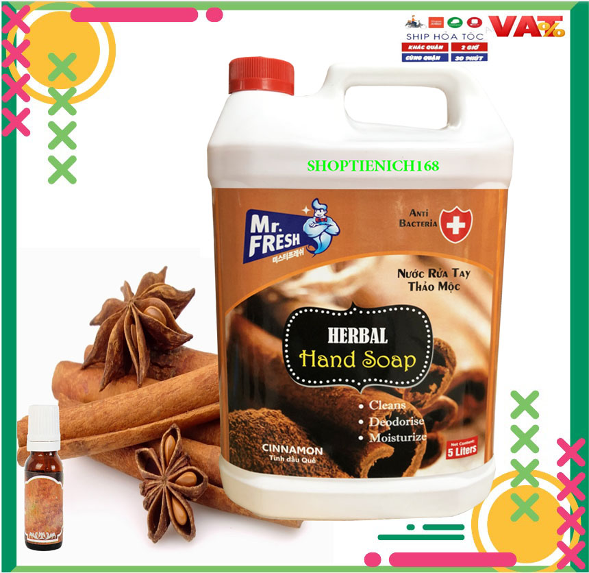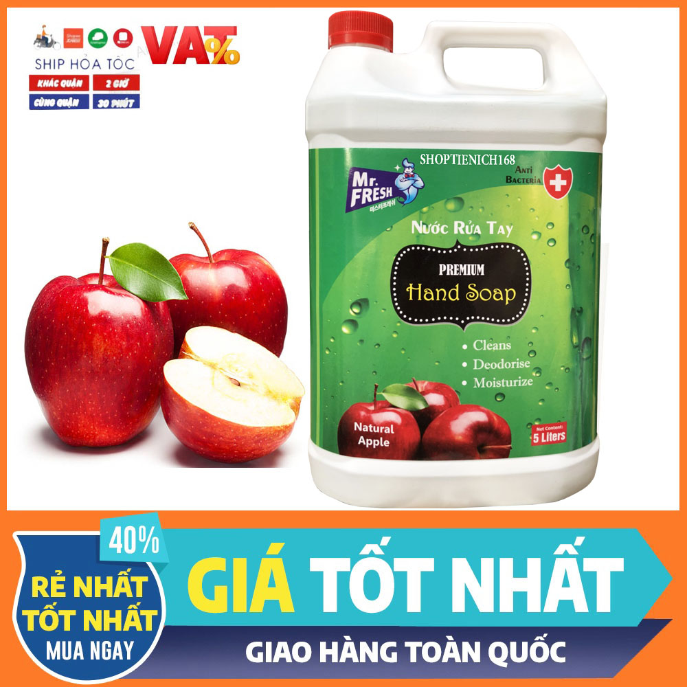 Tên sản phẩm : Nước rửa tay Premium Hand Soap Mr Fresh 5l Công dụng : Làm sạch tay, kháng khuẩn, khử mùi, giúp đôi tay mềm mại mà vẫn sạch khuẩn. Thành Phần : Linear, Benzene Sulfonate, Sodium laureth sulfate, nước , hương hoa quả.. Mùi hương : Hương Quế Hạn sử dụng : 3 năm kể từ ngày sản xuất in bao bì