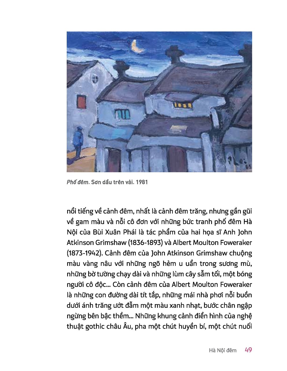 Tranh phố của Bùi Xuân Phái vừa cổ kính lại rất hiện thực, thể hiện rõ hồn cốt của phố cổ Hà Nội những thập niên 50, 60, 70. Các mảng màu trong tranh Phái thường có đường viền đậm nét, phố không những trở thành chính nó mà còn gần hơn với con người, từ bề mặt đến cảnh quan đều có chiều sâu bên trong. Ngắm tranh phố cổ của ông, người xem nhận thấy họa sĩ đã gửi gắm những kỉ niệm, những hoài cảm cùng nỗi buồn man mác, tiếc nuối bâng khuâng trên từng nét vẽ, như điềm báo về sự đổi thay và biến mất của từng mái nhà, từng con người mang hồn phách xưa cũ.” - wikipedia
