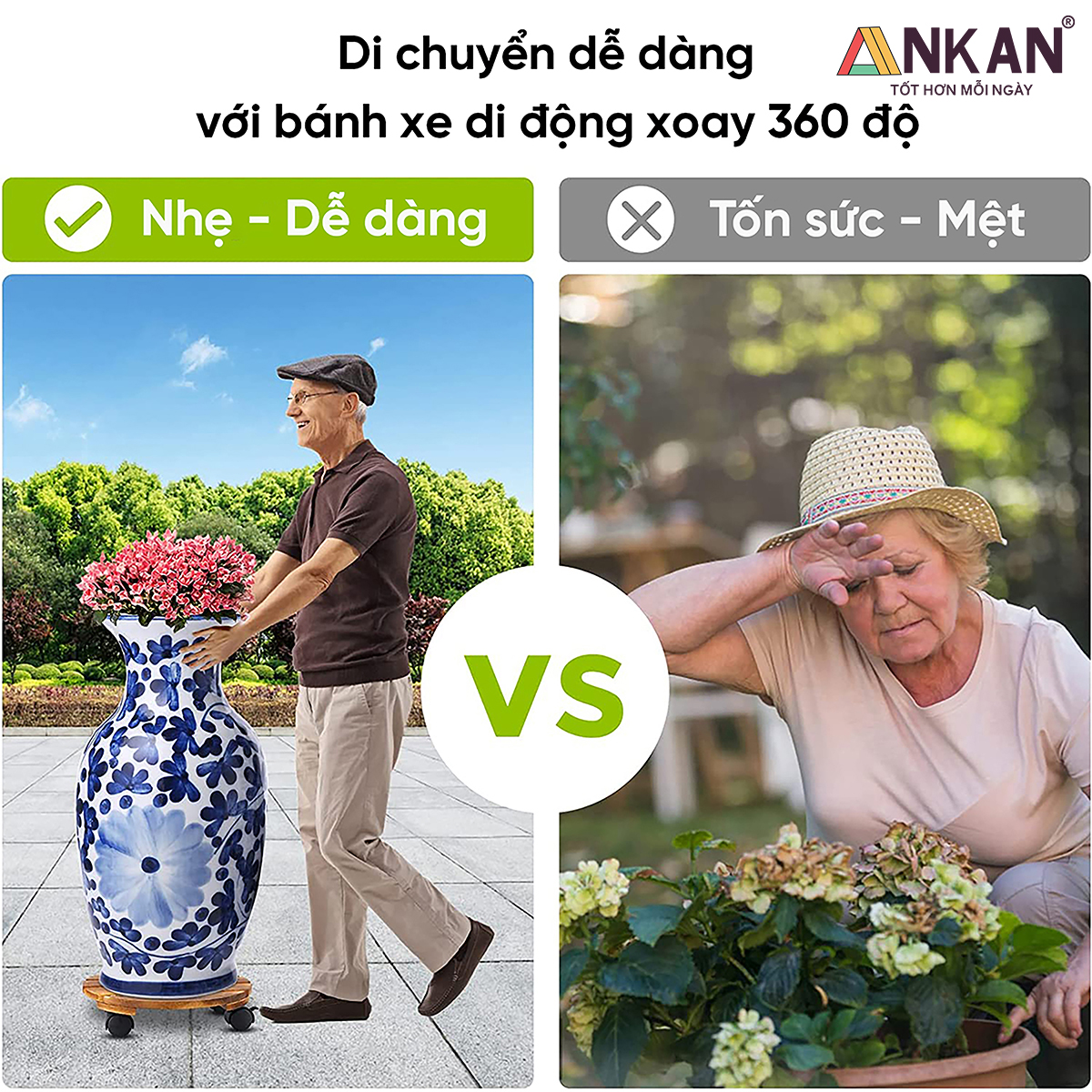 • Đế Đẩy Chậu Cây Di Động ANKAN được trang bị bánh xe xoay 360 độ, giúp bạn dễ dàng di chuyển các chậu cây nặng hoặc các lọ hoa lớn theo bất kỳ hướng nào. Với đế lót, việc di chuyển các chậu cây trở nên nhanh chóng và thuận tiện, ngay cả với phái nữ.