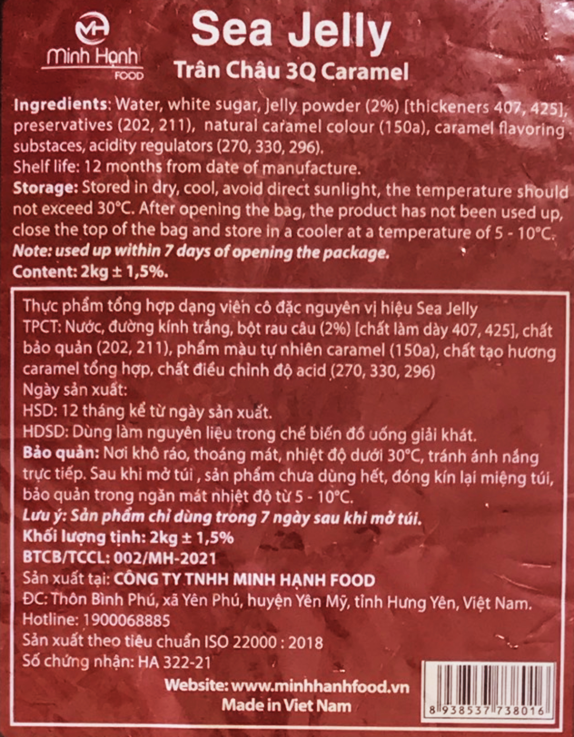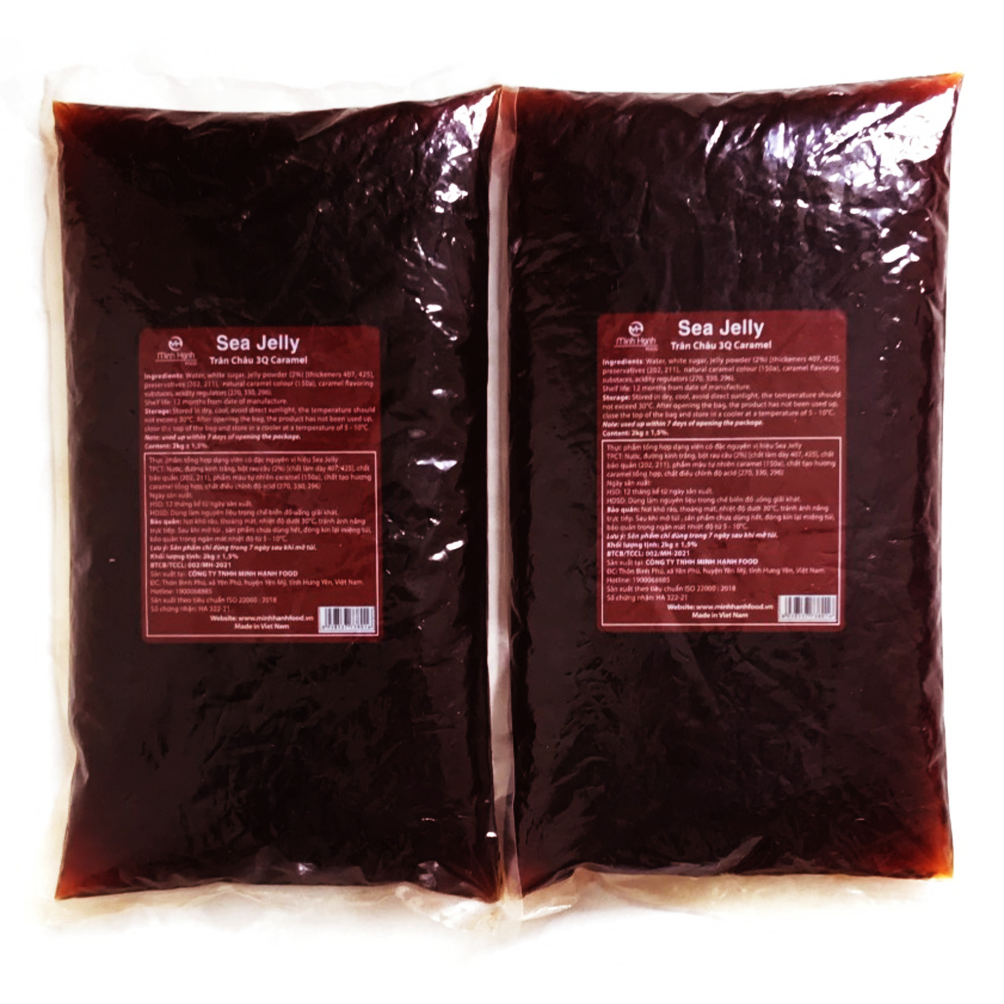Combo 2 gói Trân Châu đen 3Q Sea Jelly / Thạch 3Q Caramel Sea Jelly (mỗi gói 2 kg) Thạch Jelly hay trân châu 3Q Sea Jelly đường đen là sự kết tinh của nguồn nguyên liệu thiên nhiên, cụ thể là tảo biển và collagen động vật. Tất cả đều được làm sạch, chế biến và đóng gói theo quy trình khép kín và đảm bảo vệ sinh an toàn thực phẩm. Yếu tố này là cơ bản và điều kiện cần có để sản phẩm không chỉ được ưa chuộng trong nước mà còn xuất khẩu ra các nước trong khu vực, nhất là những thị trường “khó tính” như Nhật Bản, Hàn Quốc, Đài Loan… Trân châu 3Q Sea Jelly có thể được sử dụng làm thạch, sử dụng như một loại topping trong nước uống và pha chế trà sữa các loại. Hạt đều, căng bóng và đặc biệt dẻo dai thơm ngon đúng điệu. Hạt không bị vữa khi để qua ngày qua đêm trong nước hoặc dung dịch pha chế. Trái lại, hạt vẫn giữ nguyên chất lượng sau thao tác ngâm ủ từ 48 đến 72 giờ. Đặc biệt, khi dùng chung với sữa chua cũng vẫn giữ được độ dẻo dai vốn có. Món trà sữa vốn đã rất hút khách nay lại được “tô điểm” thêm phần hấp dẫn bởi hạt 3Q Sea Jelly thơm dẻo căng tròn lôi cuốn khi được hòa trộn. Trân châu 3Q Sea Jelly là một trong những loại hạt thêm vào trà sữa đang rất được ưa chuộng. Hầu hết các thương hiệu trà sữa nổi tiếng đều lựa chọn dòng sản phẩm này cho món nước “thần thánh” của mình thêm đậm đà.