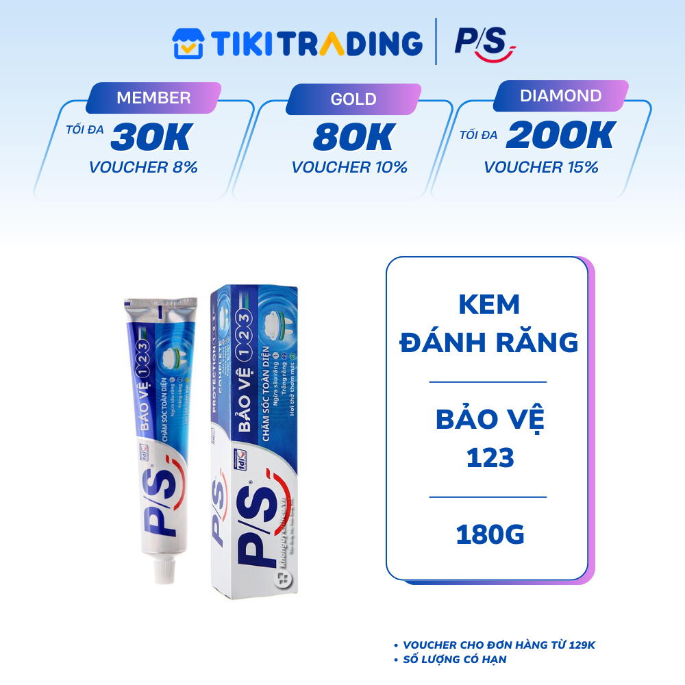 Mua tại TiktokBAO BÌ THAY ĐỔI THEO TỪNG ĐỢT NHẬP HÀNG Kem Đánh Răng P/S Bảo vệ 123 - 200g Tính năng vượt trội: Ba tác dụng ưu việt: Ngừa sâu răng, trắng răng và hơi thở thơm mát. Đặc tính: Kem đánh răng P/S Bảo Vệ 123 có 3 sọc màu đẹp mắt, mang đến cảm giác thích thú cho người tiêu dùng. 3 sọc màu đều chứa các thành phần vượt trội để bảo vệ sức khỏe cả gia đình: • Pro- fluor & Canxi: Ngừa Sâu răng và làm chắc men răng. • Hạt Perlite: Loại bỏ mảng bám và vết ố, giúp răng trắng tự nhiên. Trọng lượng: 200g. Hướng dẫn sử dụng: Sử dụng 2 lần/ ngày. Nên chải răng theo sự hướng dẫn của nha sĩ để đạt hiệu quả tốt nhất. Thông tin chi tiết vui lòng xem trên bao bì sản phẩm. Tiki.vn đảm bảo 100% sản phẩm P/s là hàng chính hãng từ nhà cung cấp.