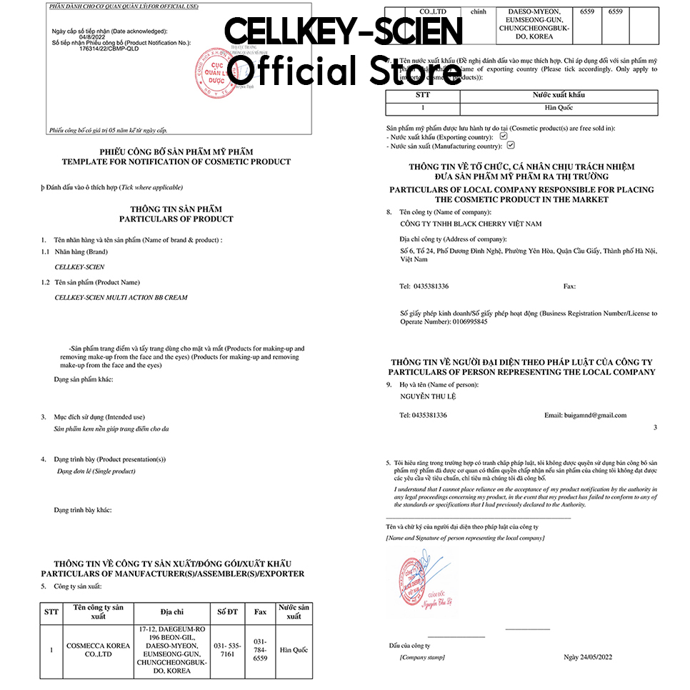- Giảm mụn, kháng viêm, chống lão hóa, giảm nếp nhăn, cải thiện cấu trúc da. Giúp cho quá trình lão hóa diễn ra chậm hơn. Đồng thời làm da căng mịn, trắng sáng. Nếu bạn từng lo lắng vì trang điểm nhiều sẽ khiến da sạm và xuống tông thì Kem Nền Che Khuyết Điểm Chống Nắng Dưỡng Da Công nghệ NANO Vàng Cellkey-Scien Multi Action BB Cream chính là sản phẩm dành cho bạn vì nó giúp giữ nguyên độ trắng và căng mịn của làn da. Không chỉ vậy, Cellkey-Scien Multi Action BB Cream còn bổ sung dưỡng chất giúp da trắng sáng một cách tự nhiên, tươi tắn. Thử ngay nàng nhé! HƯỚNG DẪN SỬ DỤNG: Lưu ý: Sau khi sử dụng đóng kín nắp sản phẩm, bảo quản nơi thoáng mát và tránh tiếp xúc trực tiếp với ánh nắng mặt trời. THÔNG TIN THƯƠNG HIỆU: Dòng sản phẩm tế bào gốc thực vật CELLKEY-SCIEN được tập đoàn COSMECCA (Một trong ba tập đoàn sản xuất mỹ phẩm lớn nhất tại Hàn Quốc) nghiên cứu và sản xuất. Tại Việt Nam, Công ty TNHH BLACK CHERRY VIỆT NAM là đơn vị nhập khẩu và phân phối duy nhất. Đặc biệt dòng sản phẩm tế bào gốc thực vật Cellkey-Scien này đã được cấp Giấy chứng nhận bảo hộ thương hiệu. Xuất xứ thương hiệu: Hàn Quốc Nơi sản xuất: Hàn Quốc Dung tích: 60ml NSX & HSD: MFD là ngày sản xuất, in trên vỏ sản phẩm - 03 năm kể từ ngày sản xuất. CELLKEY-SCIEN OFFICIAL - STORE CHÍNH HÃNG