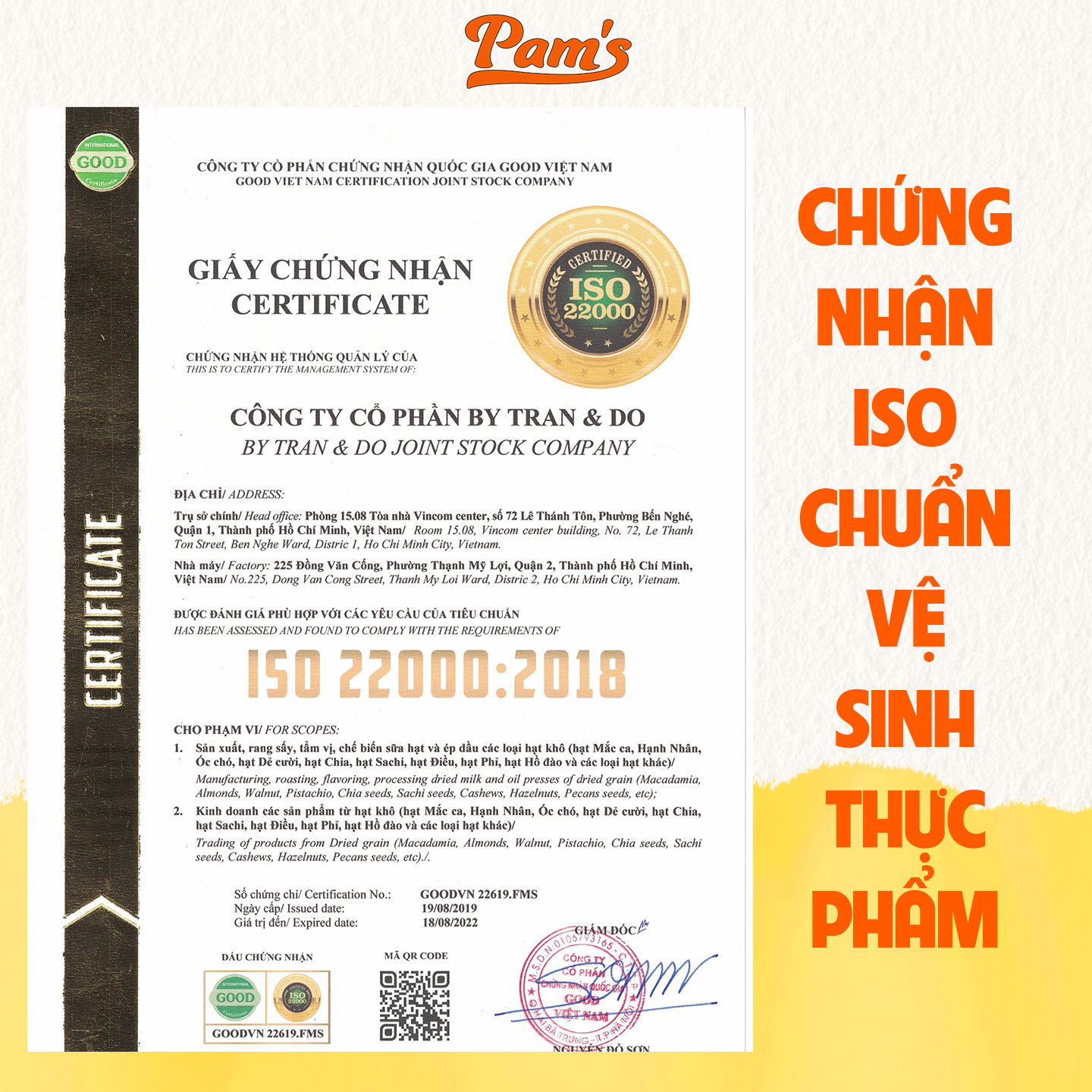 - Hạt Macca Pam's được nhập khẩu chính ngạch và chế biến, đóng gói theo qui trình khép kín chuẩn ISO22000 tại Việt Nam. Hạt Macca thành phẩm đạt chất lượng cao nhất, thơm ngon, bảo toàn các chất dinh dưỡng và khoáng chất trong hạt.