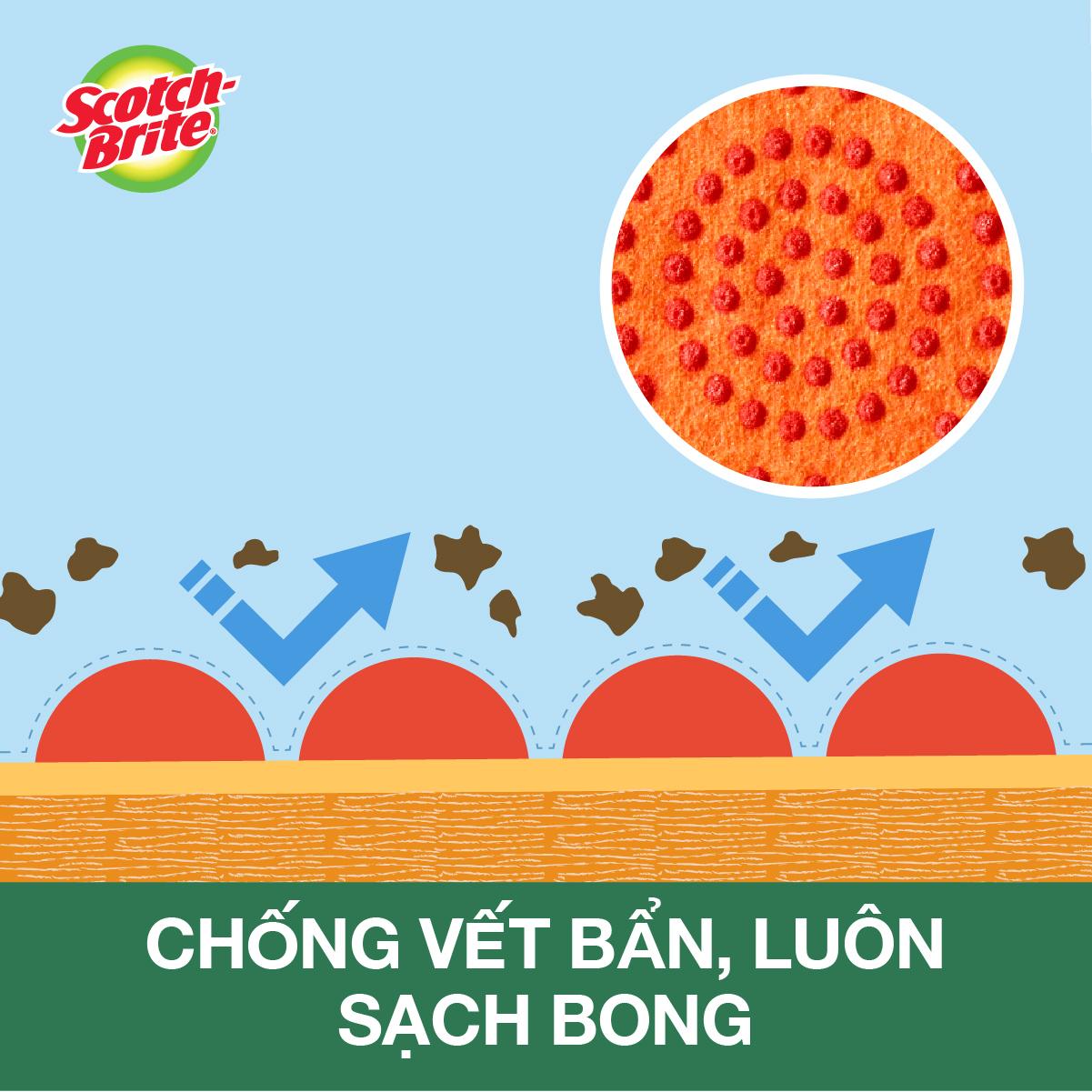 Chà mạnh mẽ - lớp phủ hạt nổi trên bề mặt miếng rửa chén gúp làm sạch các vết bẩn cứng đầu.