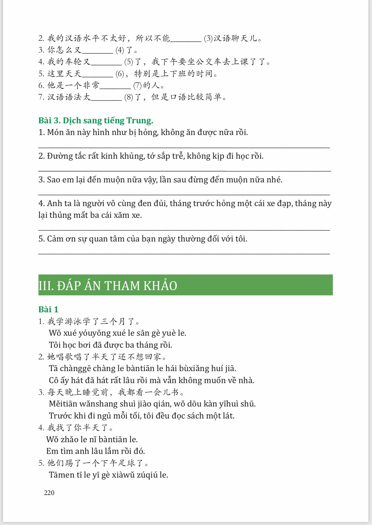Phần 4: Sau khi phân tích tỉ mỉ từng điểm ngữ pháp, cuốn sách đã thiết kế phần bài tập đa dạng bao gồm: dịch trung việt, việt trung, chữa lỗi sai, điền từ vào chỗ trống, sắp xếp câu, đảm bảo cho người học hiểu rõ và ứng dụng được 100% điểm ngữ pháp. Nội dung ví dụ xoay quanh chủ điểm của bài như mua bán, mặc cả để người học học có hệ thống. Điểm đặc biệt của cuốn sách phù hợp với người tự học đó chính là: