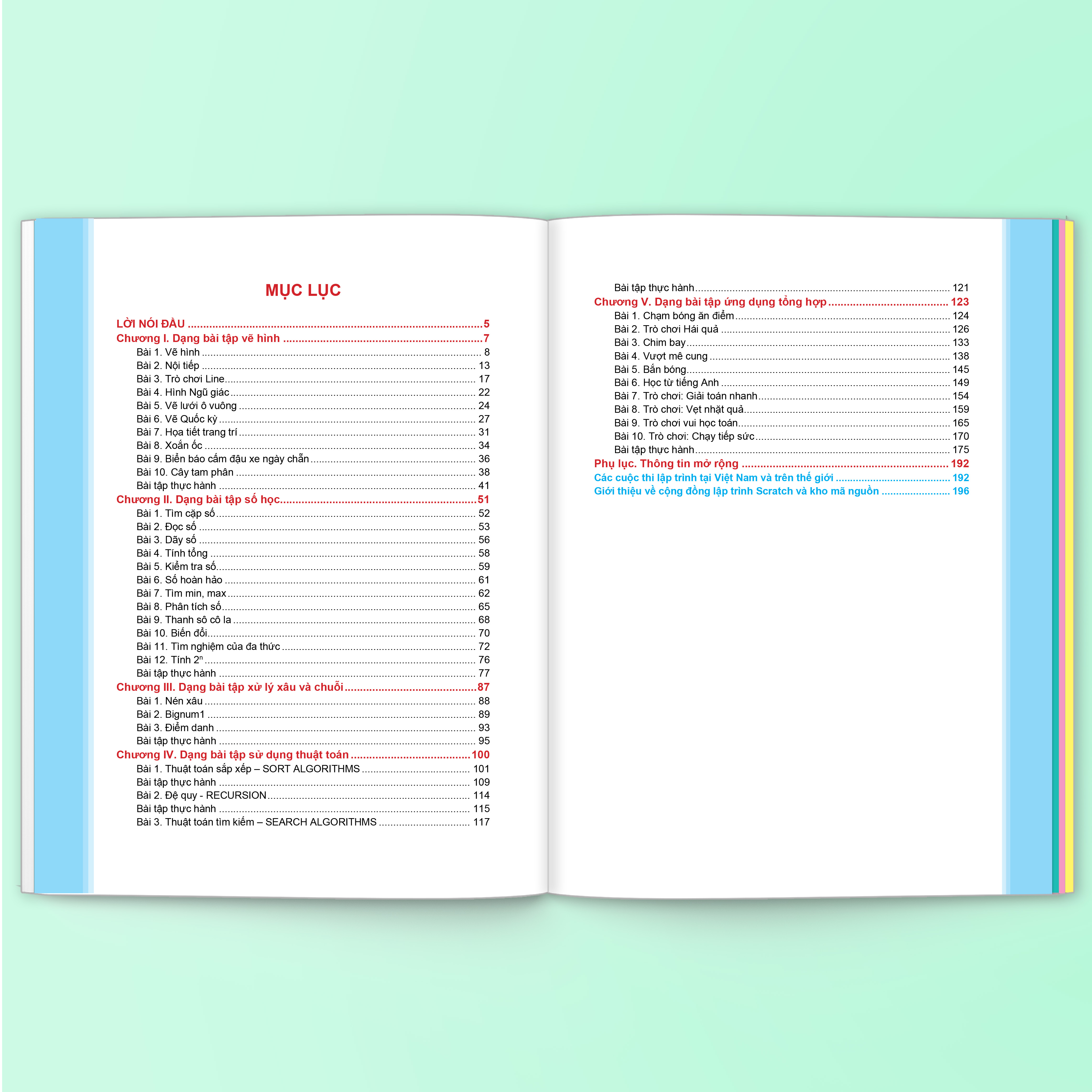 Cuốn sách gồm 05 chương, mỗi chương là một dạng bài tập khác nhau về ngôn ngữ lập trình Scratch. Mỗi dạng bài đều có hướng dẫn chi tiết giải một số bài mẫu và thư viện bài tập giúp học sinh tự ôn luyện cụ thể: Dạng bài tập vẽ hình, số học, xử lý xâu và chuỗi, thuật toán, bài tập ứng dụng tổng hợp.