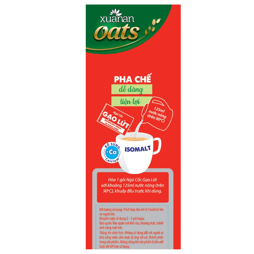 Combo Ngũ Cốc Dinh Dưỡng Canxi ít đường 400G (25G16 GÓI) + Ngũ Cốc Gạo Lứt No Sugar[đường ăn kiêng]400G (25G16 GÓI) Ngũ cốc GẠO LỨT no Sugar là thức uống thơm ngon bổ dưỡng, được làm từ gạo lứt, yến mạch, hạt sen và rất nhiều loại ngũ cốc. Sản phẩm được bổ sung thêm can xi, sử dụng đường ăn kiêng, không sử dụng đường mía. Vitamin, khoáng chất, chất xơ tự nhiên giúp hấp thu dinh dưỡng tốt và thanh lọc cơ thể. Thành phần: Ngũ cốc 60% (bột gạo lứt 10%, yến mạch 6%, đậu đen xanh lòng 3%, nếp cẩm 3%, bắp, đậu nành, gạo, lúa mỳ, lúa mạch), hạt sen 3%, bột kem thực vật, bột dừa, sữa bột tách béo 7% (Instant skim milk powder 7%), Isomalt 3%, Canxi 0.7%, Muối I-ốt, Chất làm dày xanthan gum (E415), chất tạo ngọt (INS 951), chất chống đông vón (E551), Maltodextrin, hương liệu tổng hợp dùng cho thực phẩm. Ngũ cốc DINH DƯỠNG can xi được làm từ rất nhiều loại ngũ cốc bằng công thứ đặc biệt. Sản phẩm được bổ sung Can xi giúp ngăn ngừa loãng xương và sử dụng ít đường. Vitamin, chất xơ và đạm tự nhiên là nguồn dinh dưỡng tốt cho sức khỏe. Thành phần: Ngũ cốc 32% (Yến mạch 10%, bột gạo lứt 5%, bột gạo, bột bắp, bột đậu nành, bột lúa mì, lúa mạch), sữa bột nguyên kem, bột dừa, bột kem thực vật, đường, muối i-ốt, Canxi 0.7%, maltodextrin, chất là dày xanhthan gum (E415), chất chống đông vón (E551), hương liệu tổng hợp dùng cho thực phẩm. 6.75 g đường trong 1 khẩu phần 25g. Đối tượng sử dụng: Trẻ từ 3 tuổi trở lên và người lớn, người ăn theo chế độ giảm đường. Hướng dẫn sử dụng: Hòa 1 gói với khoảng 125ml nước sôi, khuấy đều trước khi dùng. Dùng 2-3 gói mỗi ngày Bảo quản: Bảo quản nơi khô ráo, thoáng mát; tránh tiếp xúc trực tiếp với không khí và ánh nắng mặt trời. Thông tin cảnh báo: Không dùng khi sản phẩm bị rách, mốc hoặc đã hết hạn sử dụng. Sản phẩm của: Công ty TNHH Thực Phẩm Dinh Dưỡng Xuân An