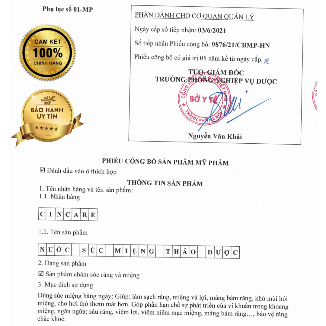 NƯỚC SÚC MIỆNG THẢO DƯỢC CINCARE: NƯỚC HOA CHO MIỆNG - LÁ CHẮN CHO RĂNG Với thành phần hoàn toàn từ thiên nhiên không chứa chất tạo màu, không cồn, không paraben, Nước súc miệng