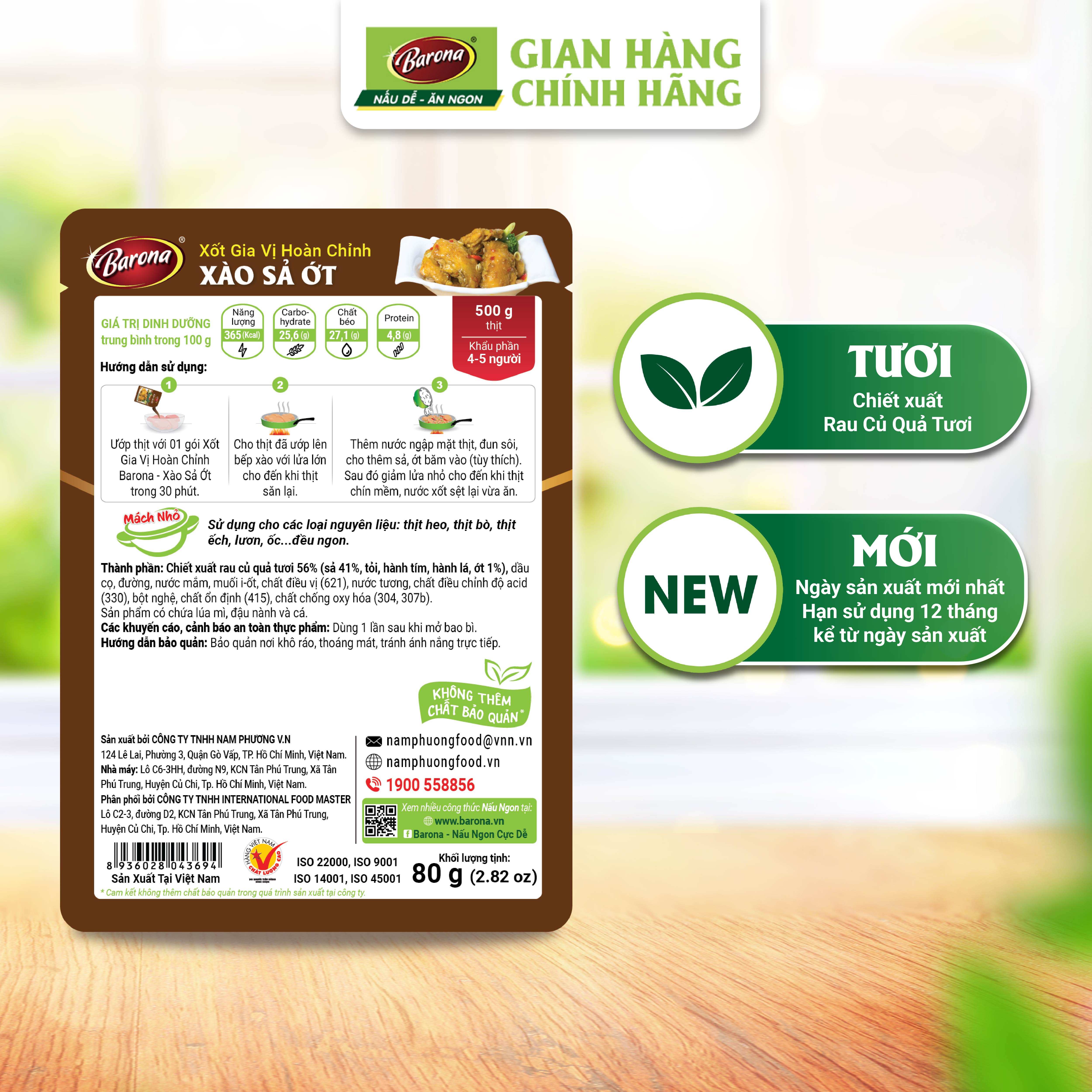 - Đạt Hàng Việt Nam Chất Lượng Cao Xốt Gia Vị Hoàn Chỉnh Barona Xào Sả Ớt có thể nấu với các nguyên liệu thịt gà, heo, bò, ếch, lươn, ốc…đều ngon. *QUY CÁCH: 80g/gói x 20 gói/hộp x 4 hộp/thùng