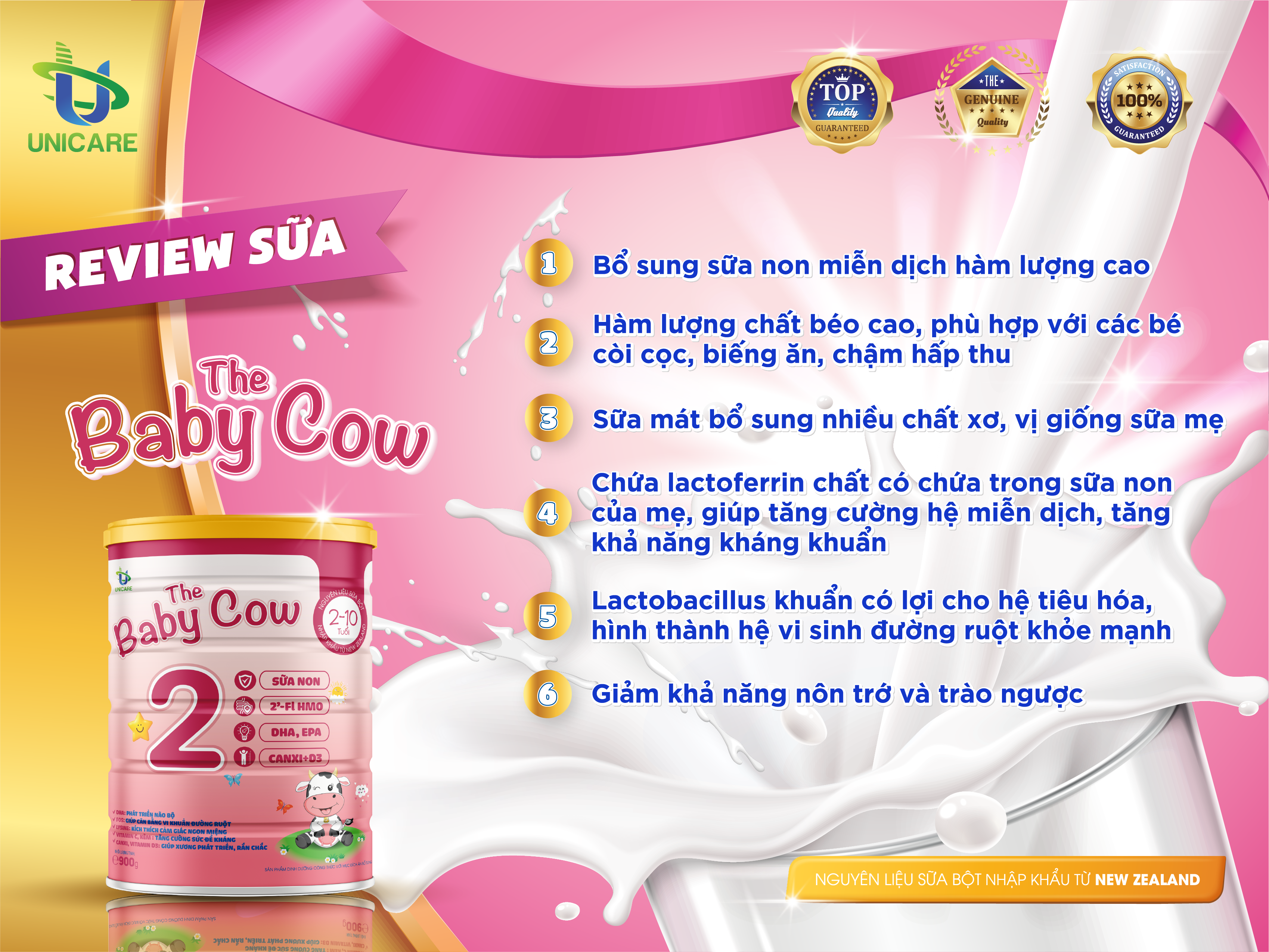 TUYỆT CHIÊU CỦA MẸ NUÔI CON NHÀN TÊNH CÙNG THE BABY COW Bật mí tuyệt chiêu của rất nhiều mẹ bỉm sữa nuôi con khỏe mạnh, ăn ngon miệng, tăng cân đều đặn cùng sữa The Baby Cow Với công thức đặc biệt từ nguồn sữa non quý giá The Baby Cow giúp bé cải thiện biếng ăn, tăng hấp thu: Sữa non: Bảo vệ hệ miễn dịch của con, bổ sung lượng kháng thể hàng đầu chống viêm nhiễm đường tiêu hóa. Lactoferrin: Tăng cường sự hấp thu sắt, góp phần tiêu diệt vi khuẩn cần sắt, đặc biệt quan trọng với hệ tiêu hóa. 2'-FL HMO: Giúp tăng khả năng miễn dịch để con luôn khỏe mạnh trong giai đoạn khoảng trống miễn dịch. Hàm lượng cao FOS giúp tăng cường tiêu hóa, tăng cường hấp thu,Lysine giúp con ăn ngon, tăng cân đều Và còn rất nhiều các dưỡng chất khác cần thiết cho sự phát triển thể chất của con trong giai đoạn này. Sản phẩm được nghiên cứu, thiết kế khoa học để đáp ứng nhu cầu dinh dưỡng và đặc biệt phù hợp với thể trạng trẻ em Việt Nam nên mẹ có thể hoàn toàn yên tâm nhé!