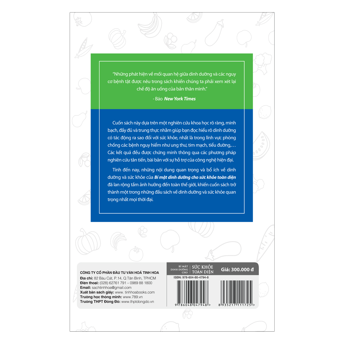 “Bí mật dinh dưỡng cho sức khoẻ toàn diện tái bản lần 2 ” không chỉ là một cuốn sách đơn thuần mà nó còn là một công trình nghiên cứu khoa học lớn nhất, kéo dài trong suốt 20 năm về mối liên hệ giữa dinh dưỡng và bệnh tật của con người từng được thực hiện trên thế giới của hai tác giả đồng thời là hai cha con, tiến sĩ T. Colin Campbell và bác sĩ Thomas M Campbell II.