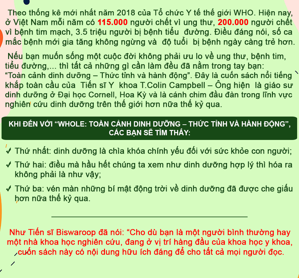 Như Tiến sĩ Biswaroop đã nói: “Cho dù bạn là một người bình thường hay một nhà khoa học nghiên cứu, đang ở vị trí hàng đầu của khoa học y khoa, cuốn sách này có nội dung hữu ích đáng để cho tất cả mọi người đọc. Bản thân tôi là một Tiến sĩ về bệnh tiểu đường và là tác giả của 25 cuốn sách về sức khoẻ thể chất và tinh thần cùng với việc đọc hơn 1.000 cuốn sách trong 10 năm qua. Nếu bạn yêu cầu tôi chọn những cuốn sách hay nhất, tôi sẽ chọn cuốn “WHOLE’’ Toàn cảnh dinh dưỡng: Thức tỉnh và hành động. Đây là một trong những cuốn sách toàn diện nhất về bệnh tật và dinh dưỡng của con người. Cuốn sách này không chỉ cung cấp cho bạn sự hiểu biết rõ ràng về mối liên quan giữa thuốc men hiện đại, dinh dưỡng và bệnh tật mà còn cho bạn sự tự tin rằng nếu bạn bị bệnh, dù bạn có bị bệnh nặng thế nào chăng nữa, nhưng bạn có khả năng chữa lành. Khi một người bị bệnh mãn tính như tắc nghẽn mạch máu do xơ vữa, thậm chí ung thư, tiểu đường nhiều năm, cuốn sách sẽ cho bạn một giải pháp thực phẩm làm thuốc để thoát khỏi bệnh tật cũng như không phụ thuộc vào thuốc suốt đời.