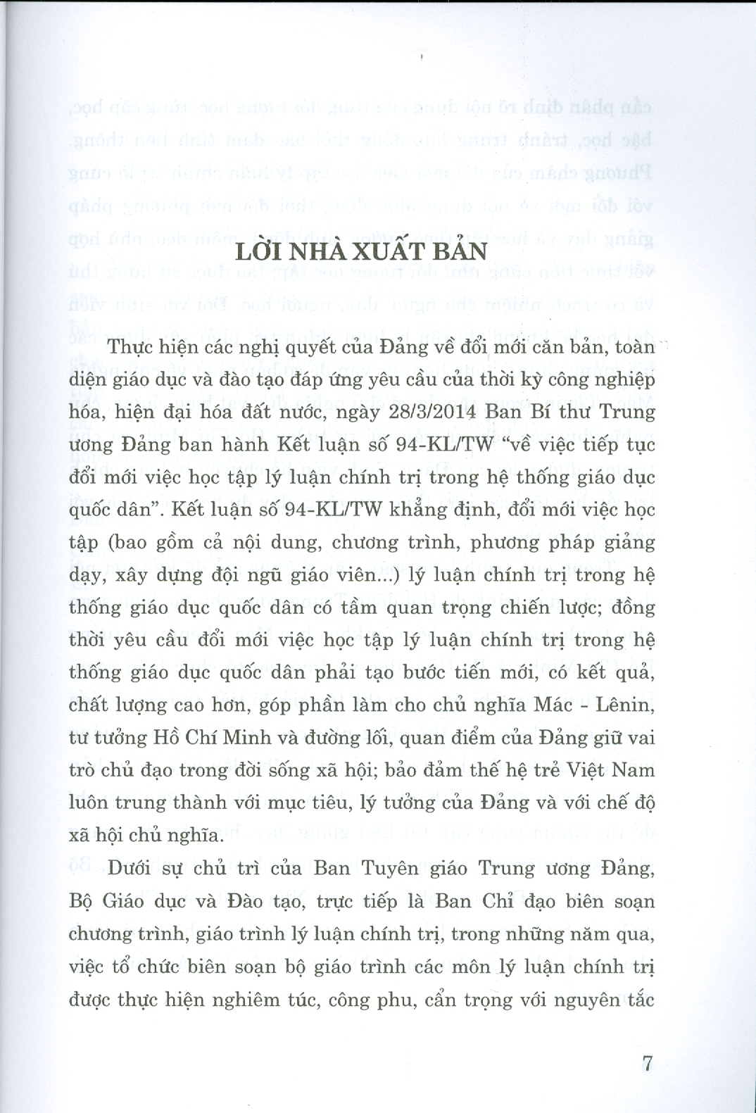 Mua tại TiktokBộ giáo trình lý luận chính trị gồm 5 cuốn dành cho bậc đại học hệ không chuyên lý luận chính trị. Bộ sách là tài liệu giảng dạy, học tập cho giảng viên, sinh viên các trường đại học theo chương trình mới do Bộ Giáo dục và Đào tạo và Nhà xuất bản Chính trị Quốc gia xuất bản. Bộ giáo trình được biên soạn theo tinh thần đổi mới cả về nội dung và phương pháp giảng dạy, tiếp cận với những phương pháp giáo dục mới, cập nhật những nghiên cứu, kiến thức lý luận chính trị mới, chú trọng liên hệ với thực tiễn công cuộc đổi mới, phát triển đất nước. Bộ giáo trình dành cho bậc đại học hệ không chuyên lý luận chính trị, cung cấp các vấn đề cơ bản nhất về chủ nghĩa Mác - Lênin, trọng tâm là về chủ nghĩa duy vật biện chứng, chủ nghĩa duy vật lịch sử, gắn với tư tưởng Hồ Chí Minh và đường lối, chủ trương của Đảng. Sách có nguồn gốc xuất xứ, rõ ràng, hợp pháp về bản quyền, có mã QRcode (mã định danh từng cuốn sách) và tem chống giả, là bản gốc, mới 100% chưa qua sử dụng của Nhà xuất bản Chính trị Quốc gia và Bộ GD&ĐT theo đúng quy định của pháp luật hiện hành. Giáo Trình Triết Học Mác – Lênin (Dành Cho Bậc Đại Học Hệ Không Chuyên Lý Luận Chính Trị) Giáo trình do Ban biên soạn gồm các tác giả là nhà nghiên cứu, nhà giáo dục thuộc Viện Triết học - Học viện Chính trị quốc gia Hồ Chí Minh, các học viện, trường đại học, Viện Triết học - Viện Hàn lâm Khoa học xã hội Việt Nam, tổ chức biên soạn trên cơ sở kế thừa những kết quả nghiên cứu trước đây, đồng thời bổ sung nhiều nội dung, kiến thức, kết quả nghiên cứu mới, gắn với công cuộc đổi mới ở Việt Nam, nhất là những thành tựu trong 35 năm đổi mới đất nước. Giáo trình gồm 03 chương: Chương 1 trình bày những nét khái quát nhất về triết học, triết học Mác - Lênin và vai trò của triết học Mác - Lênin trong đời sống xã hội. Chương 2 trình bày những nội dung cơ bản của chủ nghĩa duy vật biện chứng, gồm: vấn đề vật chất và ý thức; phép biện chứng duy vật; lý luận nhận thức của chủ nghĩa duy vật biện chứng. Chương 3 trình bày những nội dung cơ bản của chủ nghĩa duy vật lịch sử, gồm: vấn đề hình thái kinh tế - xã hội; giai cấp và dân tộc; nhà nước và cách mạng xã hội; ý thức xã hội; triết học về con người. Giáo trình được biên soạn theo yêu cầu đổi mới căn bản, toàn diện giáo dục và đào tạo, phù hợp với đối tượng người học, nhằm cung cấp những tri thức hiểu biết có tính nền tảng và hệ thống về triết học Mác - Lênin; xây dựng thế giới quan duy vật và phương pháp luận biện chứng duy vật làm nền tảng lý luận cho việc nhận thức các vấn đề, nội dung của các môn học khác; nhận thức được thực chất giá trị, bản chất khoa học, cách mạng của triết học Mác - Lênin. Đồng thời, giúp cho sinh viên vận dụng tri thức triết học Mác - Lênin, thế giới quan duy vật và phương pháp luận biện chứng duy vật để rèn luyện tư duy, giúp ích trong học tập và cuộc sống. Giáo Trình Kinh Tế Chính Trị Mác – Lênin (Dành Cho Bậc Đại Học Hệ Không Chuyên Lý Luận Chính Trị) Giáo trình do PGS.TS. Ngô Tuấn Nghĩa chủ biên, cùng tập thể tác giả là những nhà nghiên cứu, nhà giáo dục có nhiều kinh nghiệm tổ chức biên soạn. Giáo trình gồm 6 chương: Chương 1 cung cấp những tri thức cơ bản về sự ra đời và phát triển của môn học kinh tế chính trị Mác - Lênin; đối tượng nghiên cứu, phương pháp nghiên cứu và chức năng của khoa học kinh tế chính trị Mác - Lênin trong nhận thức cũng như trong thực tiễn. Chương 2 cung cấp một cách có hệ thống về lý luận giá trị lao động của C. Mác thông qua các phạm trù cơ bản về hàng hóa, tiền tệ, giá cả, quy luật giá trị, tính hai mặt của lao động sản xuất hàng hóa, năng suất lao độ Chương 3 trình bày ba nội dung: 1) Lý luận của C. Mác về giá trị thặng dư, đây cũng chính là nội dung cốt lõi học thuyết giá trị thặng dư của C. Mác, hòn đá tảng trong lý luận kinh tế chính trị của C. Mác; 2) Tích lũy tư bản (cách thức sử dụng giá trị thặng dư); 3) Phân phối giá trị thặng dư trong nền kinh tế thị trường tự do cạnh tranh tư bản chủ nghĩa. Chương 4 cung cấp hệ thống tri thức lý luận của V.I. Lênin về độc quyền và độc quyền nhà nước trong nền kinh tế thị trường tư bản chủ nghĩa. Chương 5 cung cấp tri thức lý luận cơ bản về nền kinh tế thị trường mang đặc thù phát triển của Việt Nam, vấn đề quan hệ lợi ích và bảo đảm hài hòa các quan hệ lợi ích trong phát triển ở Việt Nam. Chương 6 cung cấp hệ thống tri thức về công nghiệp hóa, hiện đại hóa ở Việt Nam trong bối cảnh thích ứng với cuộc Cách mạng công nghiệp lần thứ tư; trong đó đề cập những nội dung cơ bản như: khái quát lịch sử các cuộc cách mạng công nghiệp; khái quát về công nghiệp hóa và cá
