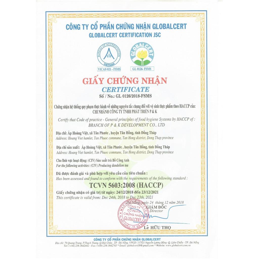 100% Bồ Công Anh, Bồ Công Anh được chọn là giống Bồ Công Anh ngoại nhập, được công ty P&K trồng theo quy trình kiểm nghiệm của Viện nghiên cứu phát triển cây trồng tỉnh Đồng Tháp, sản xuất theo quy trình khép kín, đảm bảo vệ sinh an toàn thực phẩm.
