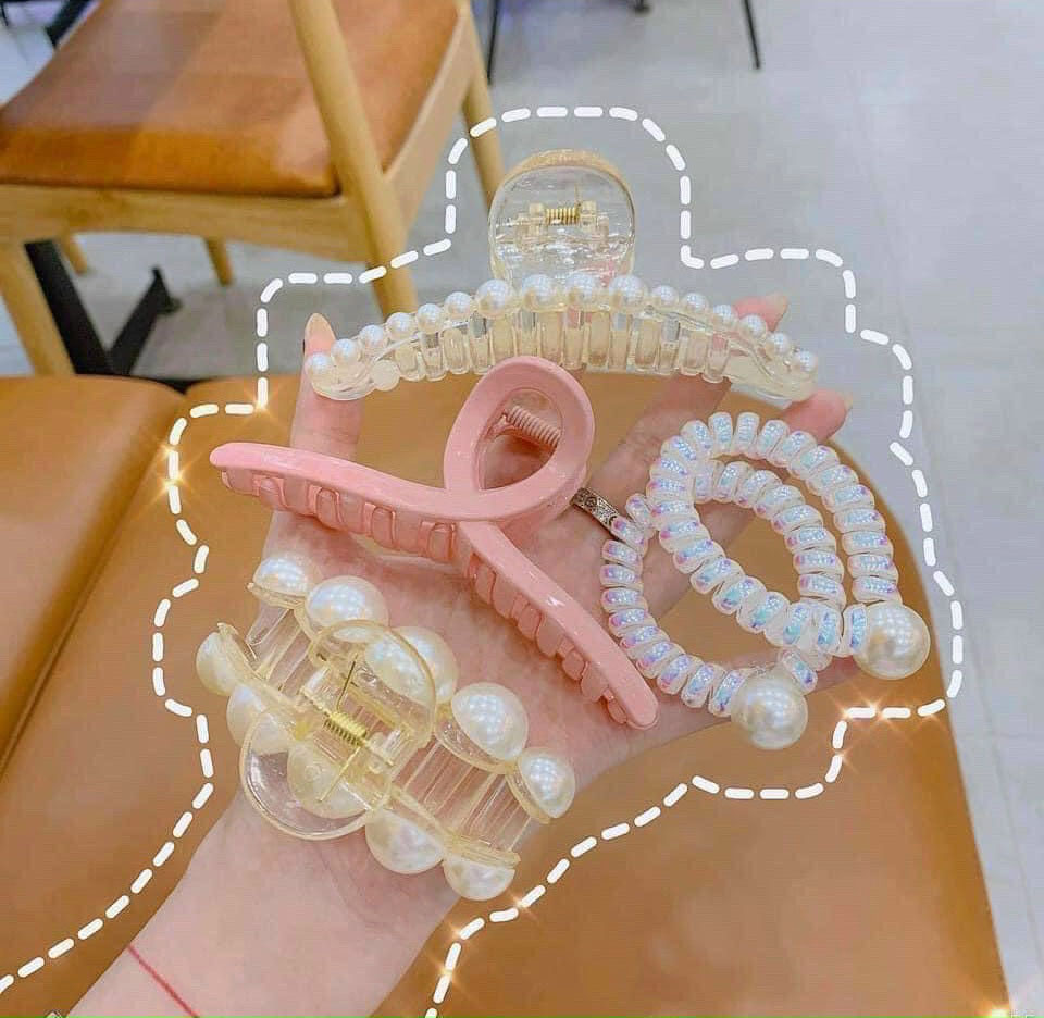 Bộ 5 món kẹp tóc đính ngọc trai, cột tóc Hàn Quốc phong cách trẻ trung xinh xắn KT28 Kẹp càng cua, dây buộc tóc đính ngọc trai là món phụ kiện tóc rất được