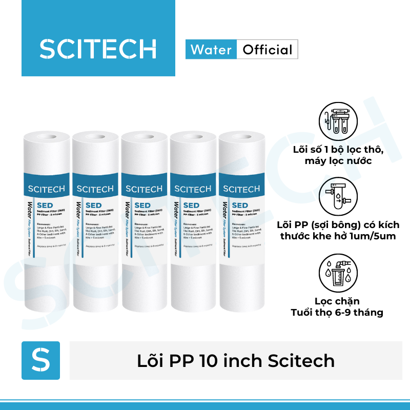 Bộ lõi 1,2,3 10 inch by Scitech giúp sơ bộ lọc loại bỏ các cặn bẩn, rong rêu, bùn đất, tạp chất thô, chất lơ lửng, chất hữu cơ, trong nước và giúp bảo vệ,