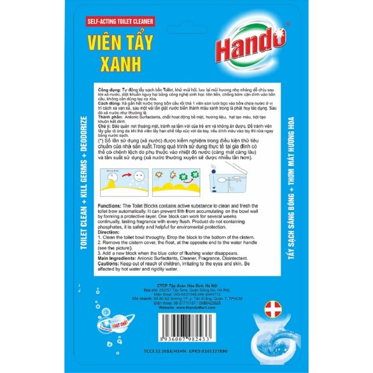 Thông tin sản phẩm Tên sản phẩm : Viên tẩy sạch và làm thơm xanh Hando 5 viên Value Pack Công dụng : Tự động tẩy sạch bồn toilet, khử mùi hôi, lưu lại mùi