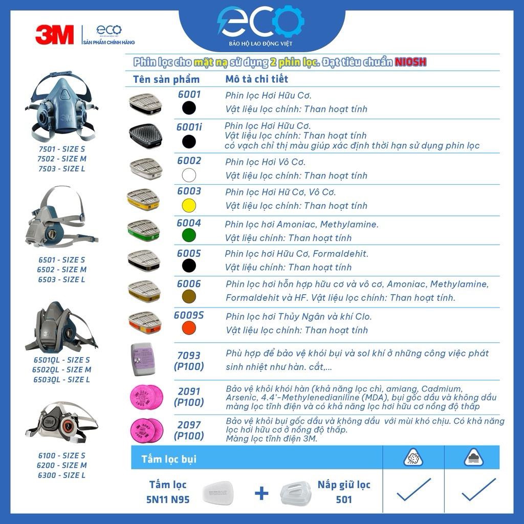 Combo 7 món gồm mặt nạ 3M 7501 hoặc 7502, phin lọc 3M 6006, tấm lọc bụi 5N11, và nắp giữ 501 — một trong những lựa chọn cao cấp và đa năng nhất trong