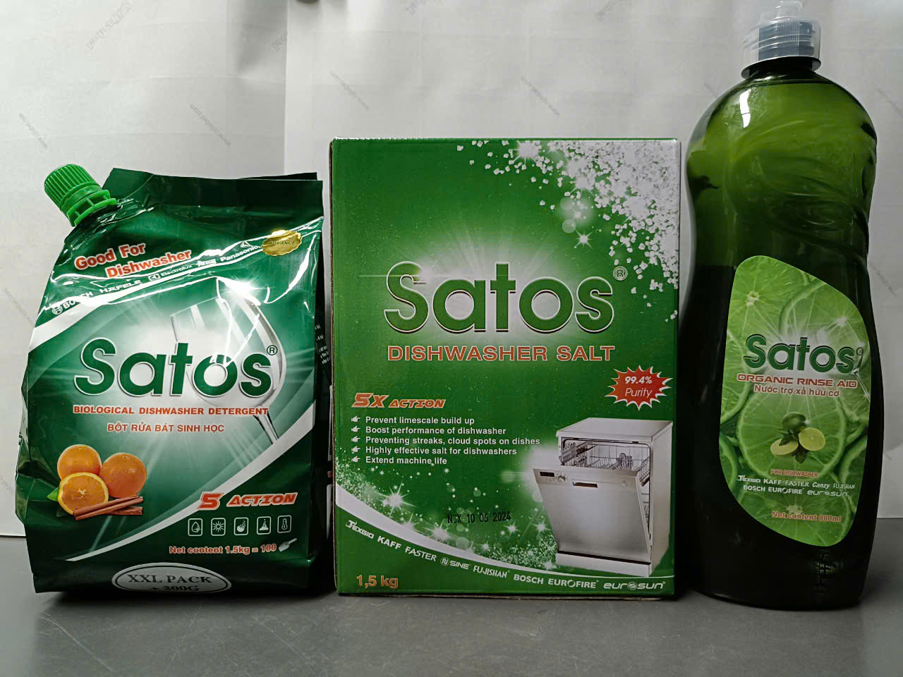 COMBO Bột rửa bát sinh học Satos+Muối 1.5kg+Bóng 800ml hữu cơ - Dùng cho máy rửa bát