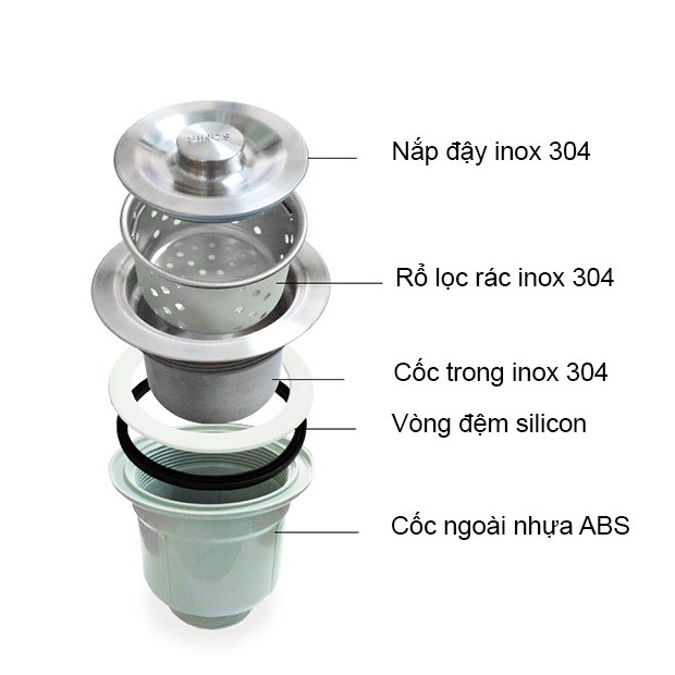 Bộ xi phông, ống xả 2 hố có cốc lọc rác & nắp đậy được làm từ Inox đảm bảo không hoen gỉ trong môi trường nước. Nắp đậy & các khớp nối có gioăng đảm bảo kín nước, không bị rò gỉ sau thời gian dài sử dụng.