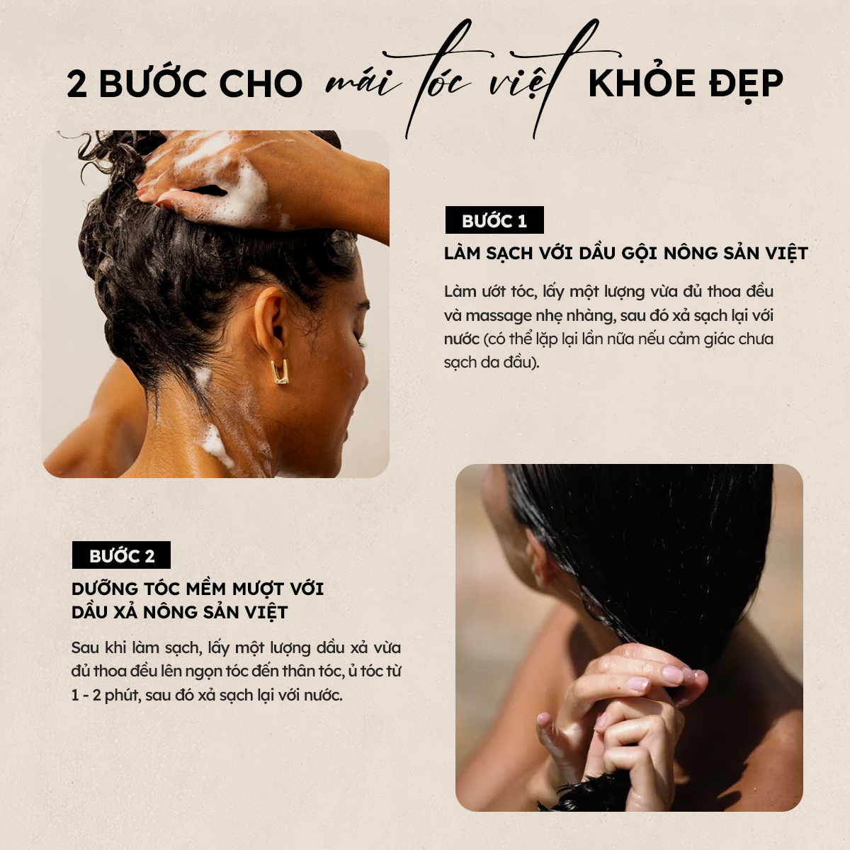 Dầu gội – Dầu xả Nông Sản Việt kết hợp chiết xuất bưởi, chanh, cà phê, gừng, rau má, trà đen – những nông sản quen thuộc, giàu dưỡng chất, giúp làm sạch tóc dịu nhẹ, nuôi dưỡng da đầu khỏe mạnh.