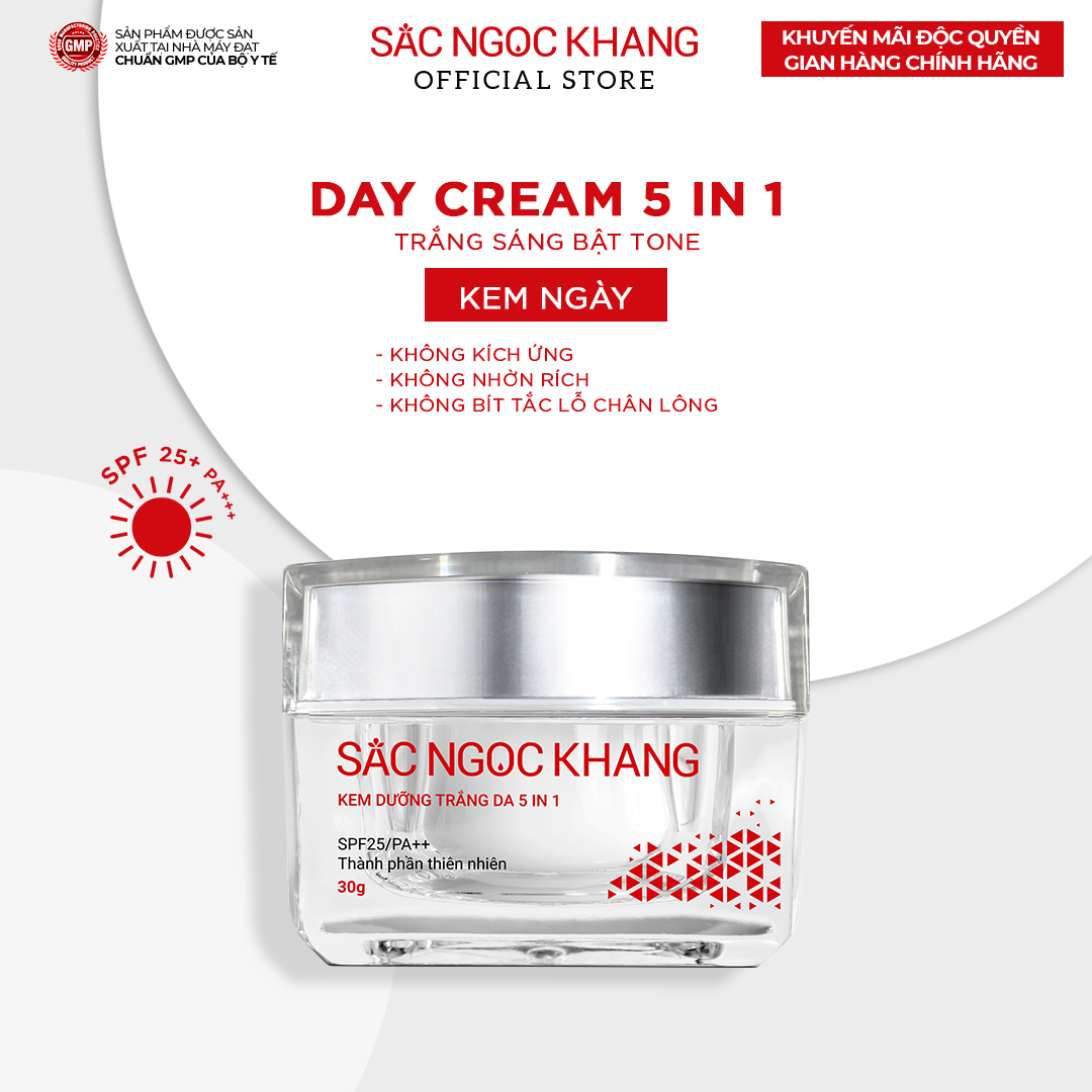 - Kem dưỡng da ban đêm Sắc Ngọc Khang Hộp 30g Kem dưỡng Sắc Ngọc Khang 5 trong 1 ban ngày 30ml giúp nuôi dưỡng làn da sáng khỏe, mờ thâm nám ngăn ngừa lão hóa Dưỡng sáng vượt trội – nâng tông tự nhiên – chống nắng – dưỡng ẩm căng mịn – ngăn ngừa lão hóa 1.Thành phần chính:
