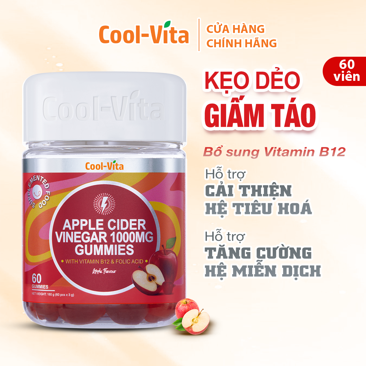 - Thân thiện với người ăn chay, an toàn và lành mạnh: Sản phẩm có chứa pectin thực vật, phù hợp cho người ăn chay, không chứa màu, hương liệu và chất bảo quản nhân tạo mà sử dụng màu sắc và hương vị tự nhiên. Vì sao nên chọn Kẹo Dẻo Giấm Táo COOL-VITA? Tiện lợi và dễ sử dụng: Chỉ với 2 viên kẹo dẻo mỗi ngày, hỗ trợ bạn bổ sung 1000mg giấm táo và các dưỡng chất thiết yếu mà không cần phải pha chế phức tạp. Vị táo tươi mát, dễ chịu: Kẹo dẻo có vị táo tự nhiên, không gây ngán, mềm mịn, dễ ăn mà không bị dính răng. Sản phẩm an toàn, không chứa màu, hương liệu và chất bảo quản nhân tạo mà sử dụng màu sắc và hương vị tự nhiên, phù hợp với nhiều đối tượng người dùng. Khối lượng tịnh: 180g (60 viên x 3g) Thành phần: Đường trắng tinh luyện, Siro mạch nha (38,6%), Giấm táo (17,4%), Chất làm dày: Pectin, Chất điều chỉnh độ acid: Acid citric, Dầu thực vật (chứa chất chống đông vón: Sáp carnauba), Hương liệu táo tự nhiên, Chất điều chỉnh độ acid: Natri citrat, Chất tạo màu tự nhiên: Nước ép trái cây và rau quả, Vitamin B6 (dạng Pyridoxin hydrochlorid) (0,026%), Acid Folic (0,017%), Iốt (Kali iodid) (0,0023%), Bột củ dền, Bột lựu đỏ, Vitamin B12 (dạng Cyanocobalamin) (0,0001%). Hướng dẫn sử dụng: