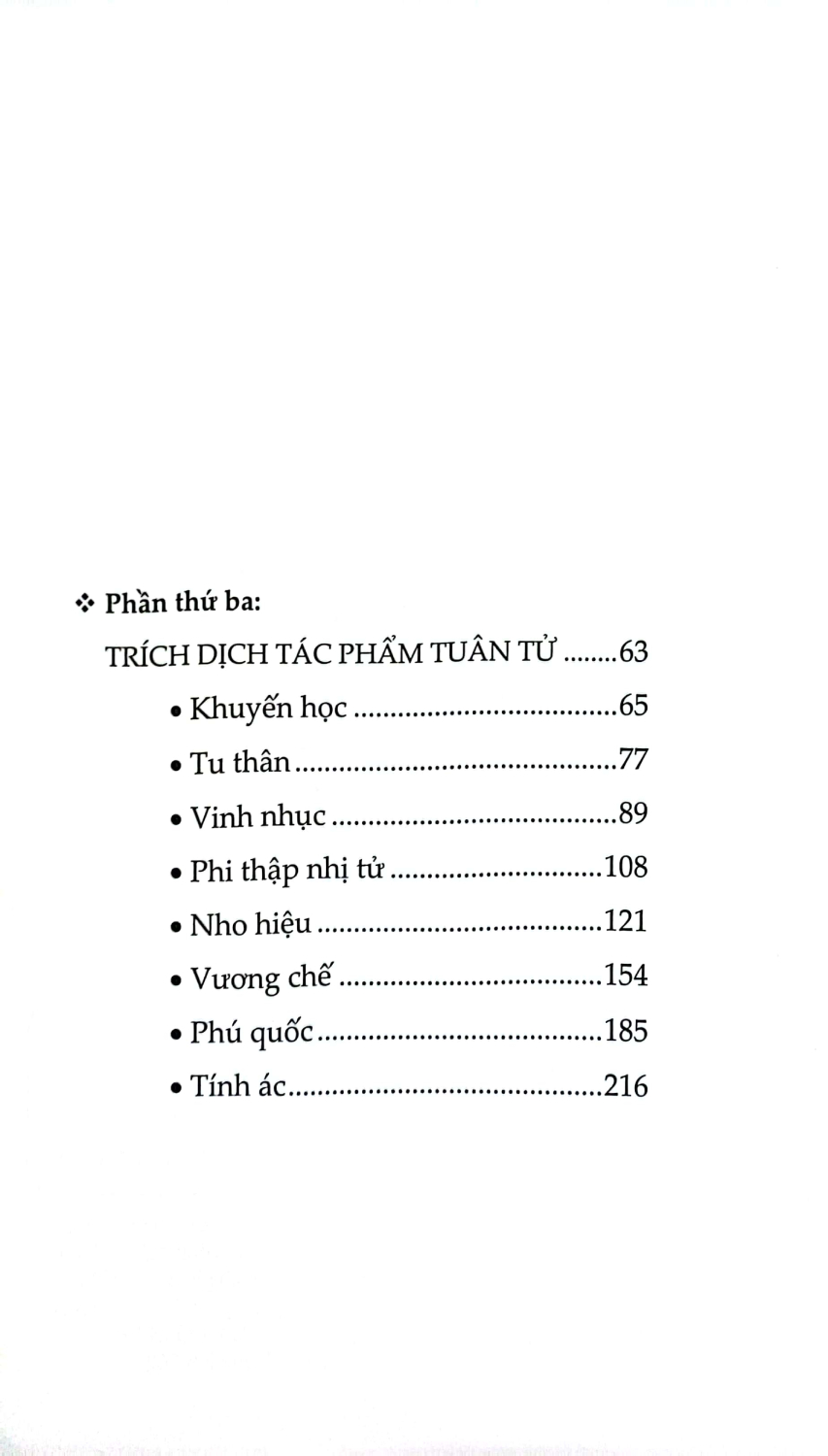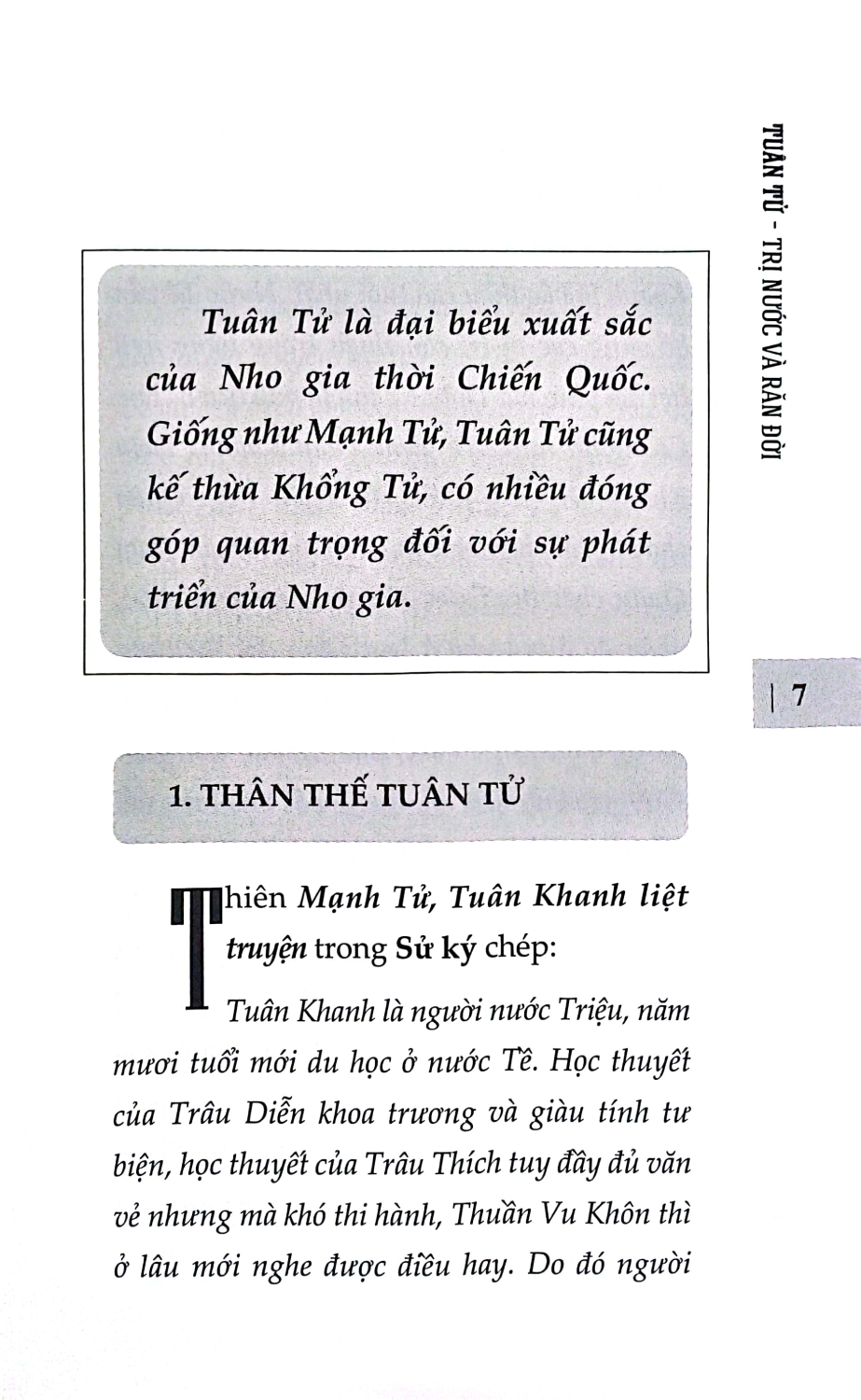 Tuân Tử - Trị Nước Và Răn Đời Thời Tây Hán, Tuân Tử được xếp vào hàng danh nho, địa vị sánh ngang với Mạnh Tử. Tư Mã Thiên viết Sử ký, ghép truyện Mạnh Tử và Tuân Tử chung một thiên, xem hai ông là những người kế thừa xuất sắc của Khổng Tử. Nhưng về sau thì địa vị của Mạnh Tử lại vượt hơn. Cũng từ thời Bắc Tống, lý học ngày càng phát triển, Tuân Tử càng bị chỉ trích gay gắt. Nhìn chung, có hai nguyên nhân khiến Tuân Tử bị chỉ trích: một là bởi thuyết tính ác, hai là bởi Hàn Phi và Lý Tư. Nạn đốt sách chôn nho dưới thời Tần Thủy Hoàng, các nhà nho đời sau quy hết trách nhiệm cho Hàn Phi và Lý Tư. Tuân Tử là thầy của họ, đương nhiên không tránh khỏi liên lụy. Trình Di (1033-1107) nhận xét: Tuân Tử không thuần chính cực độ, chỉ một câu tính ác, gốc lớn của Nho gia đã mất rồi. Trong bài Tuân Khanh luận, Tô Đông Pha (1037-1101) nói: Tuân Khanh ưa chuộng dị thuyết mà không biết khiêm nhường, dám luận bàn cao xa mà không biết xem xét. Lời lẽ của ông ta, hạng người ngu thì kinh sợ, kẻ tiểu nhân thì thích thú. Sau Cách mạng Tân Hợi (1911), khi phong trào Tân văn hóa đang phát triển mạnh mẽ, trong bài Độc Tuân Tử thư hậu của Ngô Ngu (1872-1949) đăng trên Tân thanh niên ngày 1 tháng 3 năm 1917, Tuân Tử bị phê phán: Đọc sách của Tuân Khanh, thấy tông chỉ là đề cao quân vương, hạ thấp bề tôi, làm cho dân chúng ngu muội... Nền chuyên chế ở Trung Hoa do Tần Thủy Hoàng lập nên, có Lý Tư giúp sức, nhờ Tuân Khanh gợi mở, được Khổng Tử dạy cho. Gần nửa thế kỷ sau, Tuân Tử mới được đánh giá khách quan hơn, những đóng góp của ông với triết học Trung Hoa mới được ghi nhận đầy đủ: Tuân Tử tiếp thu rộng rãi tinh hoa tư tưởng của các nhà, đồng thời nghiêm khắc phê phán họ, kể cả một số học phái của Nho gia. Đáng chú ý nhất là việc Tuân Tử phê phán học phái của Tử Tư và Mạnh Tử, đó là đỉnh cao của cuộc đấu tranh giữa chủ nghĩa duy vật với chủ nghĩa duy tâm thời Chiến Quốc. Do vậy, Tuân Tử xứng đáng được xem là người tổng kết triết học cổ đại.