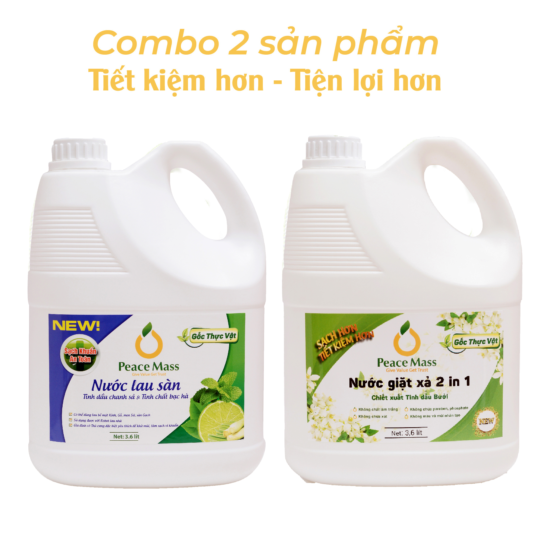 ✨Combo Sản Phẩm Gốc Thực Vật NGB4 Peace Mass Nước Giặt Xả 2 in 1 3.6 l + Nước Lau Sàn TD Chanh Sả -Bạc Hà 3.6l (Thuộc nhóm Sản phẩm Lành tính / Sinh học)