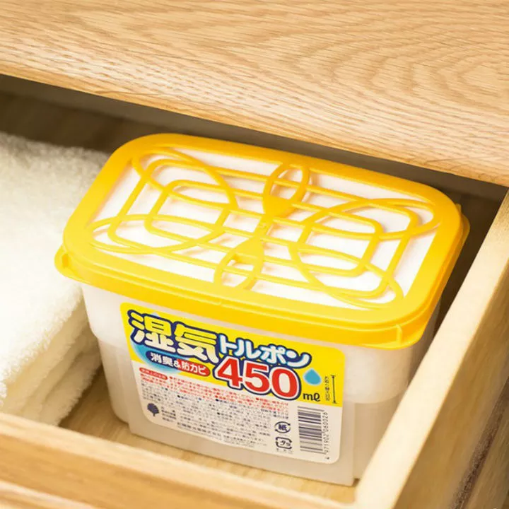 Hộp hút ẩm, khử mùi Nhật Bản 450ml Thành phần: Calcium chloride, chất khử mùi, chất chống mốc... vv Màu sắc: Màu vàng Kích thước: 9.5x3.3x5.6Hcm Dung tích: 450ml Công dụng: * Dùng để hút