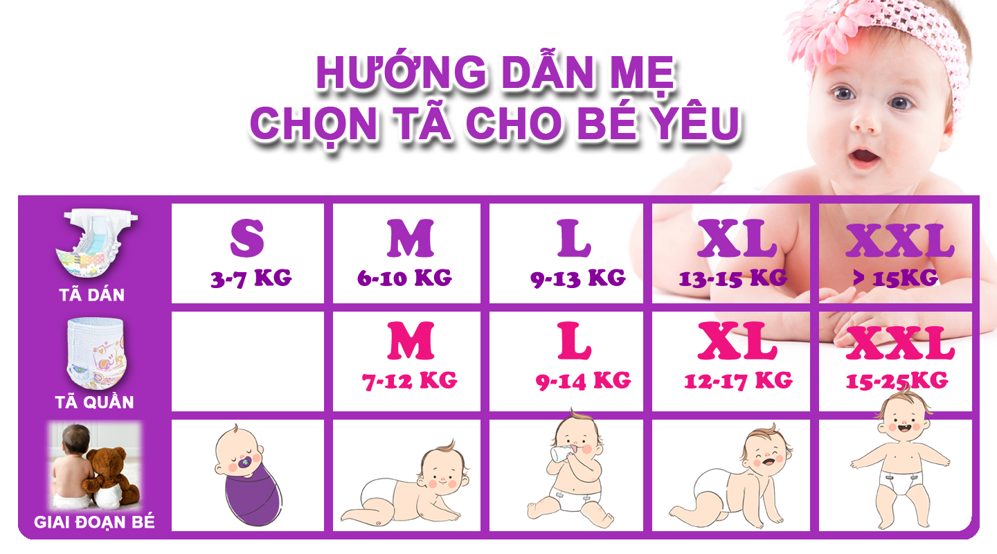 Dry-Pro có dòng tã quần Maxi-Care và tã dán Ultra-Soft, mẹ xem bảng quy đổi sau để kết hợp chọn loại tã phù hợp cho hoạt động cả ngày của bé sao cho bé luôn thoải mái mà lại tiết kiệm (ví dụ mẹ có thể dùng tã quần lúc ban ngày và tã dán trong lúc bé ngủ)