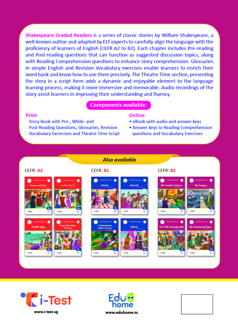 Shakespeare Graded Readers is a series of classic stories by William Shakespeare, a well-known author and adapted by ELT experts to carefully align the language with the proficiency of learners of English (CEFR A2 to B2). Each chapter includes Pre-reading and Post-reading questions that can function as suggested discussion topics, along with Reading Comprehension questions to enhance story comprehension. Glossaries in simple English and Revision Vocabulary exercises enable learners to enrich their word bank and know how to use them precisely. The Theatre Time section, presenting the story in a script form adds a dynamic and enjoyable element to the language learning process, making it more immersive and memorable. Audio recordings of the story assist learners in improving their understanding and fluency.