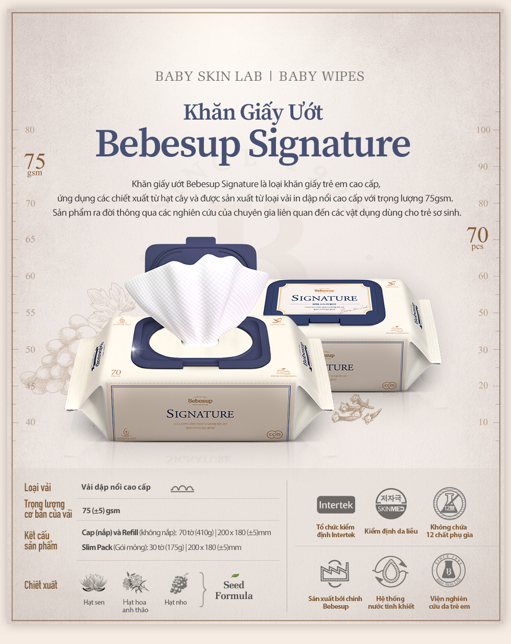 Khăn Ướt Bebesup Signature 70 Tờ/ Gói Nhập Khẩu Hàn Quốc Thương Hiệu Bebesup Thương hiệu: BEBESUP Xuất xứ: Hàn Quốc Số lượng: 1 gói (1 gói/ 70 tờ) Độ dày: 75gsm     Đối