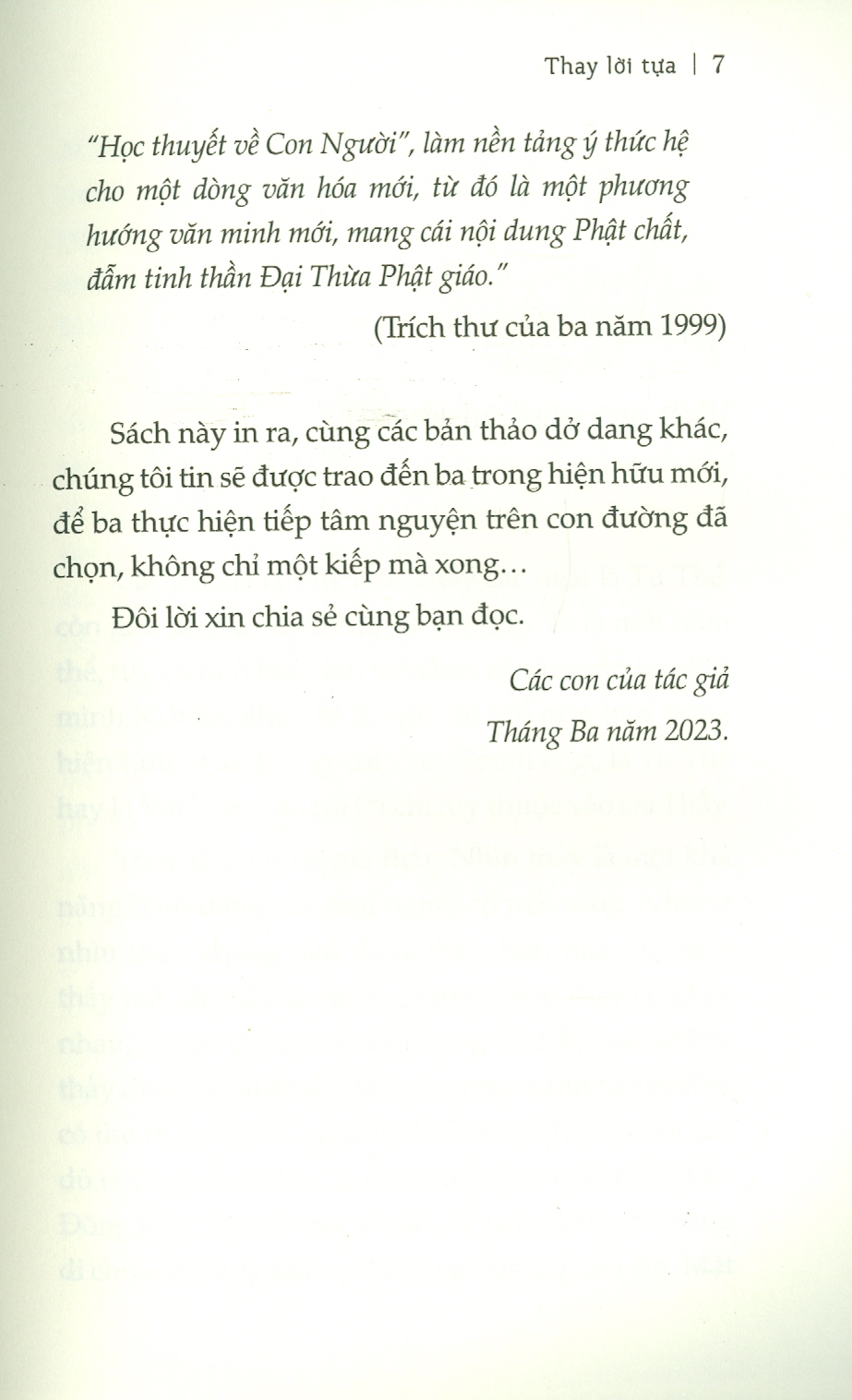 “[] Không tí chủ quan, ba tin tác phẩm này nếu không bị chôn vùi, sẽ là tư tưởng làm thức tỉnh nhận thức sai lầm của con người hiện tại. Cuốn đầu, viết năm 30 tuổi, “Con người, nhân-cách-định-mệnh” như một định nghĩa về con người theo quan niệm của ba. Cuốn “Con đường bay qua lằn ranh sinh diệt", kế tiếp như là cuốn hai thực sự đi vào những vấn đề tự thân sâu xa nhất của con người trong tự thể trầm ẩn nhất, con người chính nó thực là gì? Nó đã như thế nào trong hiện hữu cuộc sống thực tại, vì sao? Và cuối cùng, làm sao CON NGƯỜI có thể phá vỡ hiện hữu trầm luân này để đạt tới Tự Tại tức Giải Thoát [] Phải nhận thức được mình như thế nào trong đại cuộc tiến hóa, con người mới thấy ra con đường mình phải đi và cuộc đời mình phải sống. Phải sống như thế nào, đó là vấn đề khẩn thiết nhất đối với con người thế kỷ 21 trước cuộc sống hủy diệt như cuộc sống hiện đại [] Nếu [] thì tức là ba đã hoàn thành được tâm nguyện và đại nguyện: để lại đời một học thuyết Triết Đạo Học, “Học thuyết về Con Người”, làm nền tảng ý thức hệ cho một dòng văn hóa mới, từ đó là một phương hướng văn minh mới, mang cái nội dung Phật chất, đẫm tinh thần Đại Thừa Phật giáo.” – Trích thư của tác giả gửi những người con (1999)