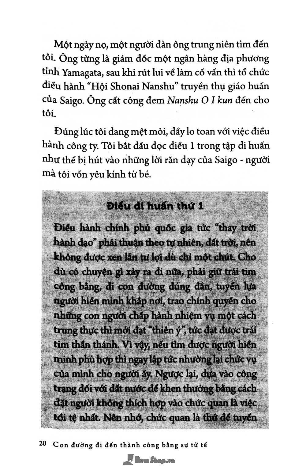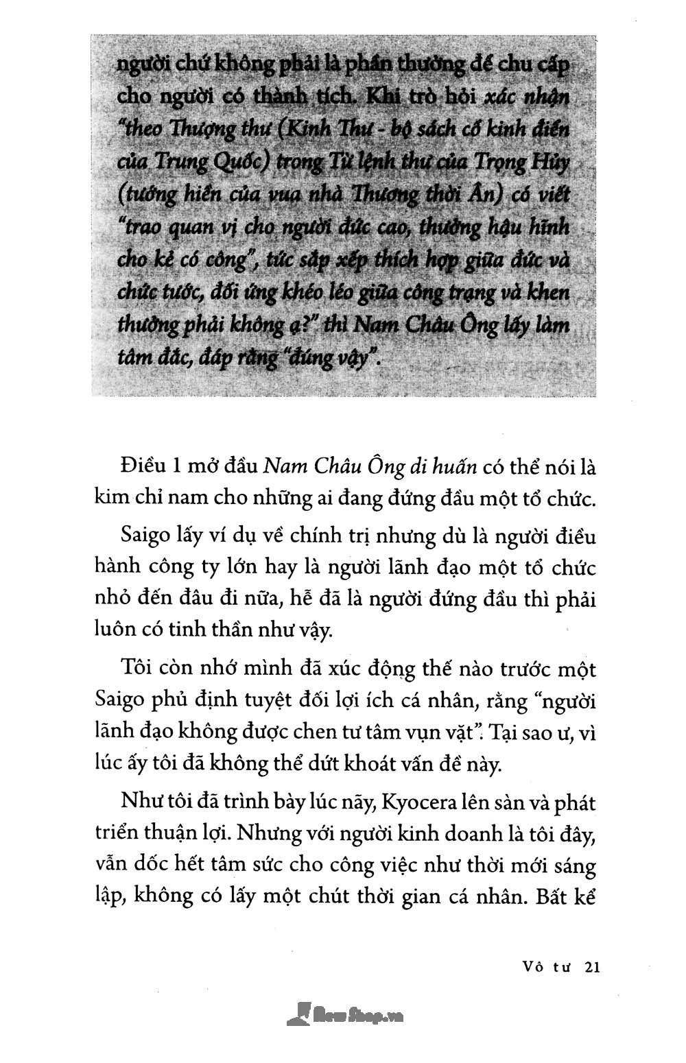 Đây là một cuốn sách "2 trong 1", bạn đọc sẽ được tìm hiểu cùng một lúc, triết lý kinh doanh của một nhà kinh doanh tài ba hàng đầu Nhật Bản hiện đại - Inamori Kazuo, và tư tưởng làm người mẫu mực của một võ sĩ samurai chân chính bậc nhất nước Nhật thời Minh Trị Duy Tân - Saigo Takamori.