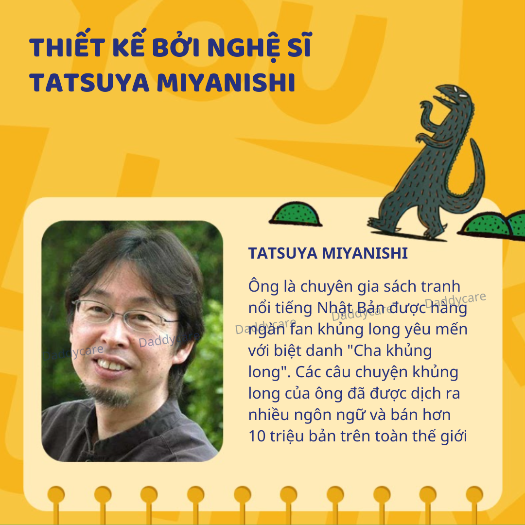 - THIẾT KẾ BỞI NGHỆ SĨ TATSUYA MIYANISHI Ông là chuyên gia sách tranh nổi tiếng Nhật Bản được hàng ngàn fan khủng long yêu mến với biệt danh "Cha khủng long". Các câu chuyện khủng long của ông đã được dịch ra nhiều ngôn ngữ và bán hơn 10 triệu bản trên toàn thế giới.