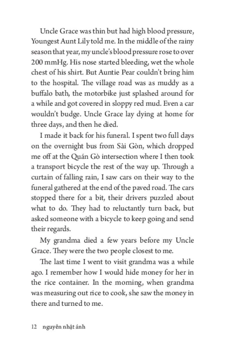 This time I will tell her that I love her very much, such a big love, and the reason why the last time I didn’t dare express my love in a natural way is because I thought I was about to die. I will tell her the story of how the doctors misdiagnosed me, and that is why I didn’t return to the village. In this spot, I will lie to Turtle a bit. I am not yet ready to mention the real reason that kept me in Sài Gòn for three whole years. The story of her origin, I will tell her later so she knows.