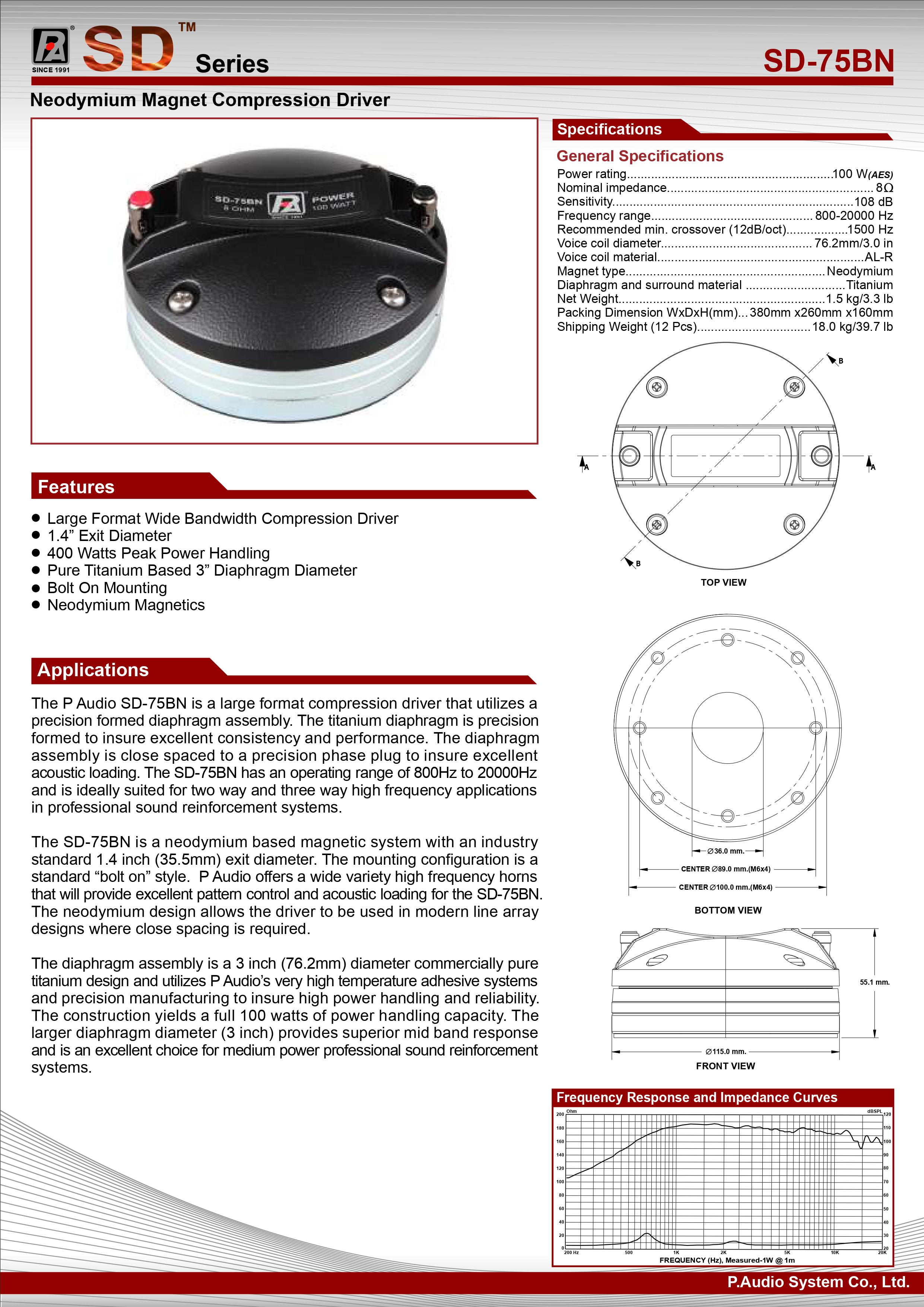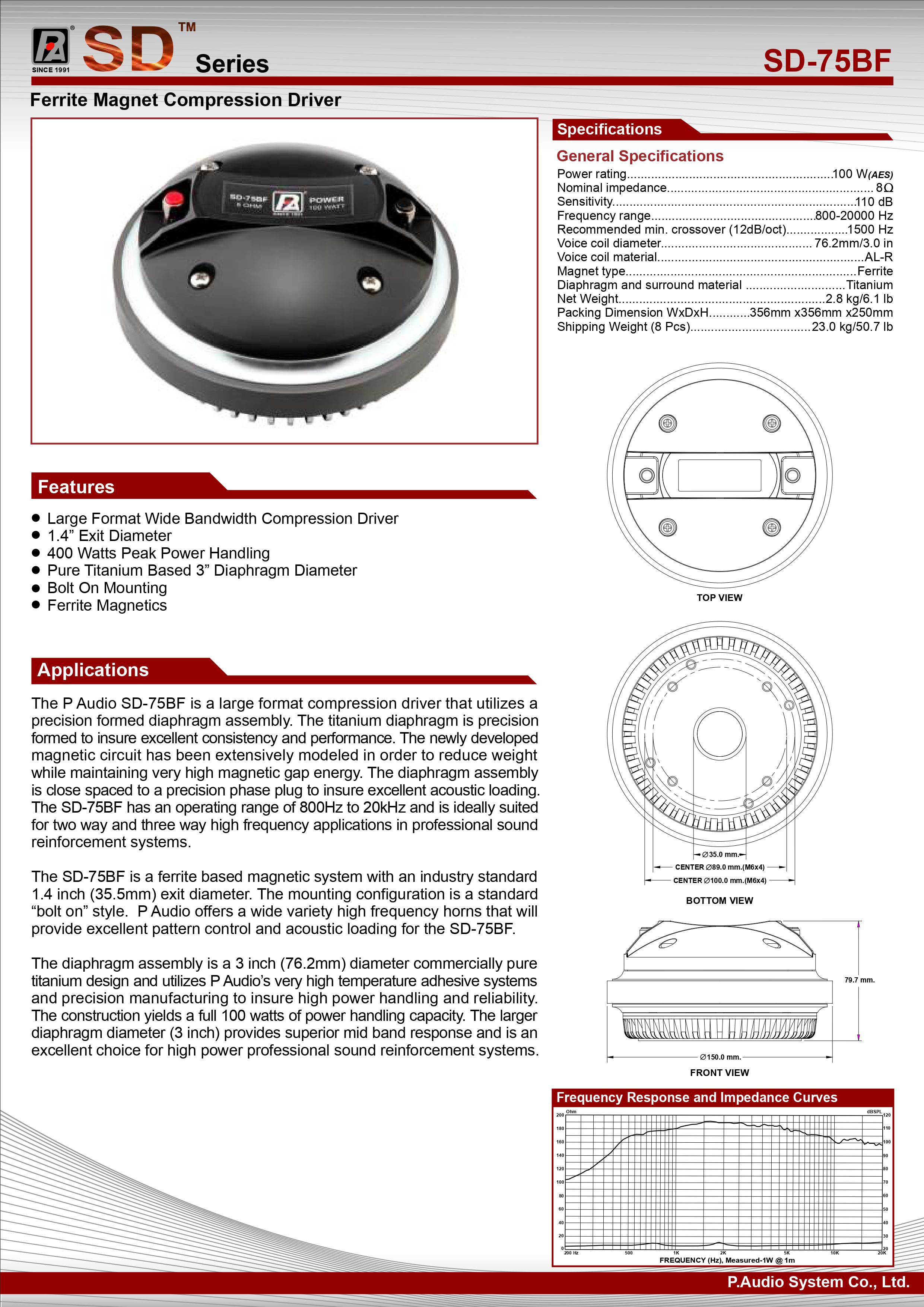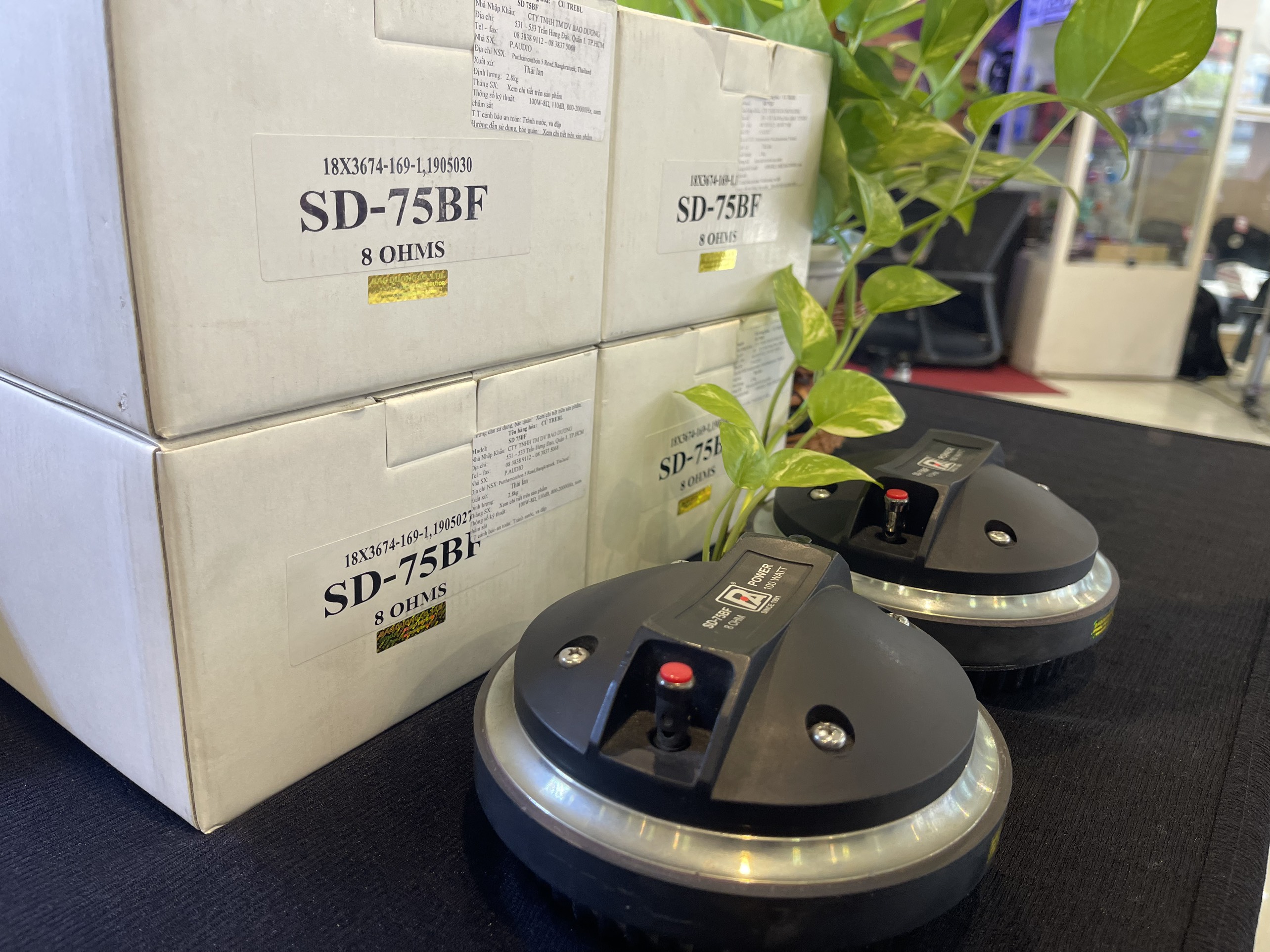 P Audio SD-75BF là trình điều khiển nén định dạng lớn, sử dụng cụm màng hình thành chính xác. Màng loa titan được hình thành chính xác để đảm bảo tính nhất quán và hiệu suất tuyệt vời. Mạch từ mới được phát triển đã được mô hình hóa rộng rãi để giảm trọng lượng trong khi vẫn duy trì năng lượng khoảng cách từ rất cao. Việc lắp ráp màng loa được đặt gần với phích cắm pha chính xác để đảm bảo tải âm tuyệt vời. SD-75BF có dải hoạt động từ 800Hz đến 20kHz và phù hợp lý tưởng cho các ứng dụng tần số cao hai chiều và ba chiều trong các hệ thống tăng cường âm thanh chuyên nghiệp. SD-75BF là một hệ thống từ tính dựa trên ferrite với đường kính thoát 1,4 inch (35,5mm) tiêu chuẩn công nghiệp. Các cấu hình gắn là một bu lông tiêu chuẩn về phong cách. P Audio cung cấp nhiều loại còi tần số cao đa dạng sẽ cung cấp khả năng kiểm soát mẫu và tải âm thanh tuyệt vời cho SD-75BF. Tổ hợp màng có thiết kế titan tinh khiết thương mại có đường kính 3 inch (76,2mm) và sử dụng hệ thống kết dính nhiệt độ rất cao của P Audio và sản xuất chính xác để đảm bảo khả năng xử lý công suất cao và độ tin cậy. Công trình mang lại công suất xử lý công suất 100 watt. Đường kính màng lớn hơn (3 inch) cung cấp đáp ứng dải giữa vượt trội và là lựa chọn tuyệt vời cho các hệ thống tăng cường âm thanh chuyên nghiệp công suất cao.