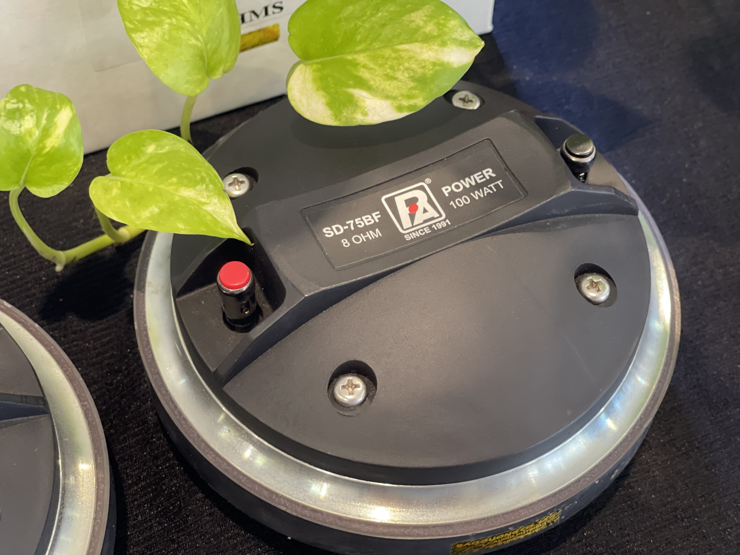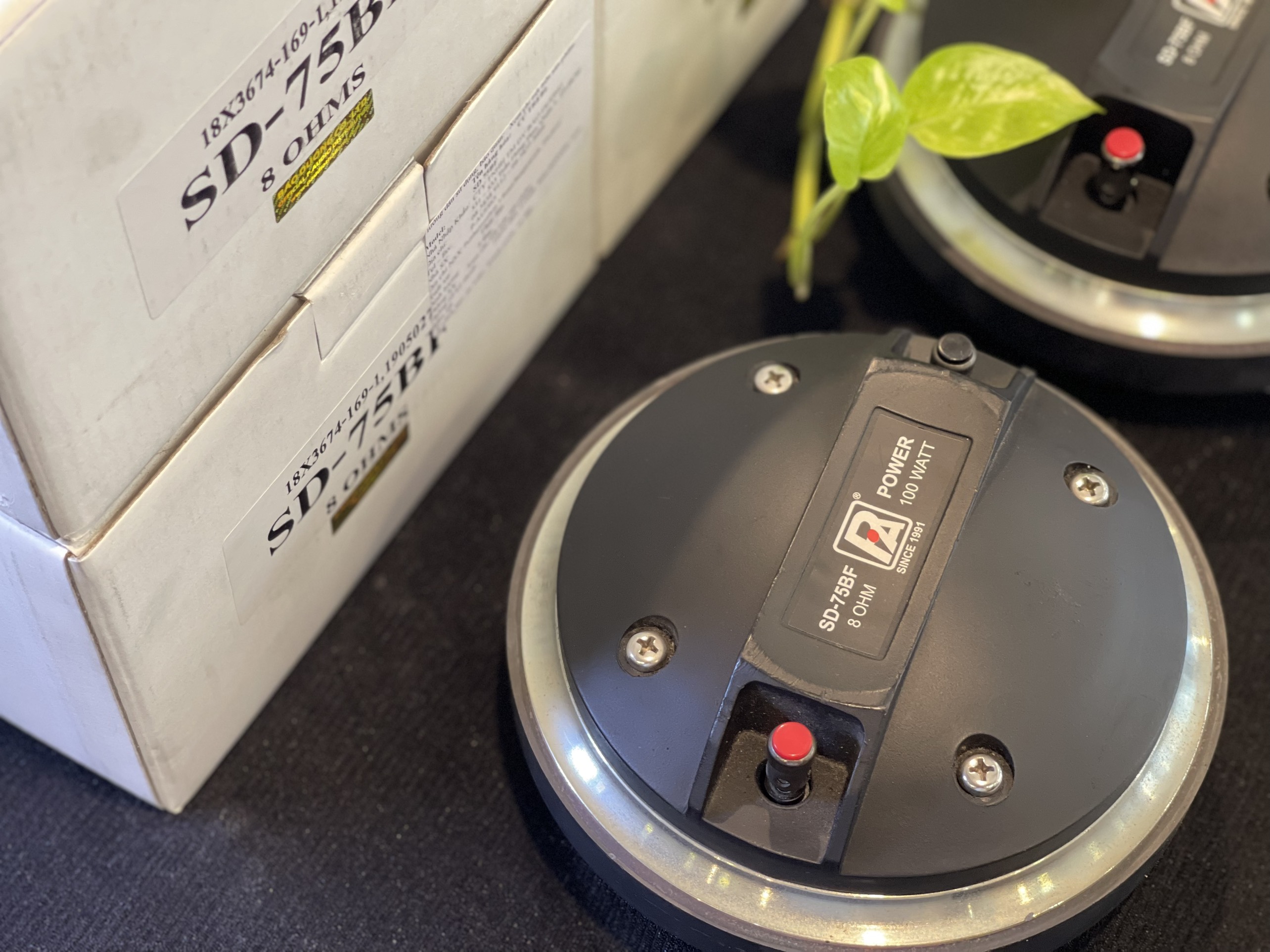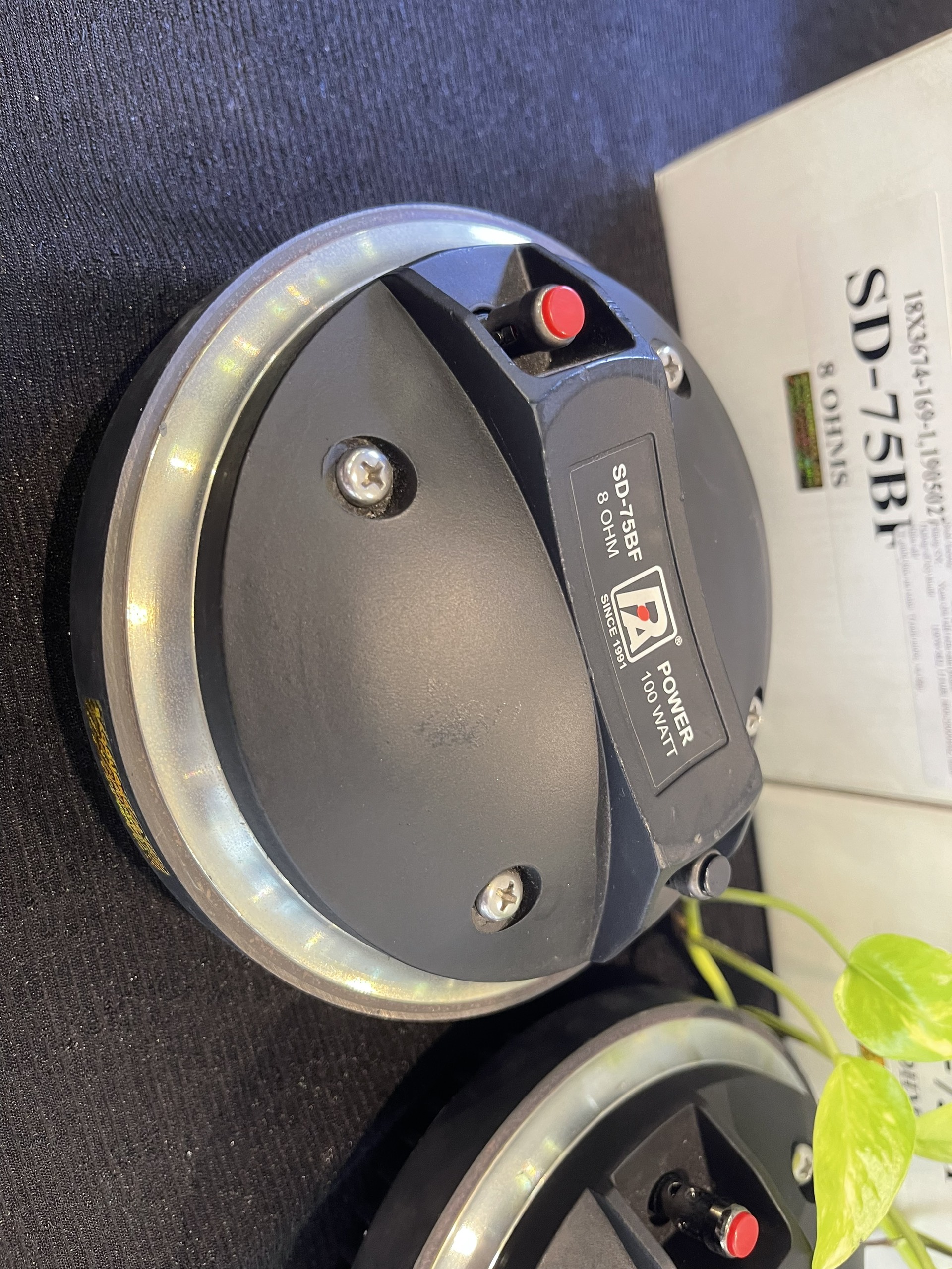 P Audio SD-75BF là trình điều khiển nén định dạng lớn, sử dụng cụm màng hình thành chính xác. Màng loa titan được hình thành chính xác để đảm bảo tính nhất quán và hiệu suất tuyệt vời. Mạch từ mới được phát triển đã được mô hình hóa rộng rãi để giảm trọng lượng trong khi vẫn duy trì năng lượng khoảng cách từ rất cao. Việc lắp ráp màng loa được đặt gần với phích cắm pha chính xác để đảm bảo tải âm tuyệt vời. SD-75BF có dải hoạt động từ 800Hz đến 20kHz và phù hợp lý tưởng cho các ứng dụng tần số cao hai chiều và ba chiều trong các hệ thống tăng cường âm thanh chuyên nghiệp. SD-75BF là một hệ thống từ tính dựa trên ferrite với đường kính thoát 1,4 inch (35,5mm) tiêu chuẩn công nghiệp. Các cấu hình gắn là một bu lông tiêu chuẩn về phong cách. P Audio cung cấp nhiều loại còi tần số cao đa dạng sẽ cung cấp khả năng kiểm soát mẫu và tải âm thanh tuyệt vời cho SD-75BF. Tổ hợp màng có thiết kế titan tinh khiết thương mại có đường kính 3 inch (76,2mm) và sử dụng hệ thống kết dính nhiệt độ rất cao của P Audio và sản xuất chính xác để đảm bảo khả năng xử lý công suất cao và độ tin cậy. Công trình mang lại công suất xử lý công suất 100 watt. Đường kính màng lớn hơn (3 inch) cung cấp đáp ứng dải giữa vượt trội và là lựa chọn tuyệt vời cho các hệ thống tăng cường âm thanh chuyên nghiệp công suất cao.