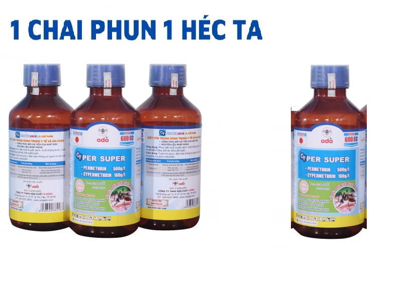 Cty Sản Xuất : Cty TNHH Pesticide Nhật Bản   Thành phần : Permethrin 50% + Cypermethrin 10% Cyper Super 600 EC là chế phẩm diệt muỗi và diệt côn trùng hiệu quả được bộ y tế công nhận sử dụng trong gia dụng và y tế. Sản phẩm sử dụng các nguyên liệu nhập ngoại rất an toàn. Nguyên liệu nhập Ấn Độ ( ko phải Trung Quốc nha )        - Sản phẩm sử dụng các nguyên liệu nhập ngoại rất an toàn.     - Hàng phun diệt muỗi và ruồi cực mạnh .   - tỉ lệ pha : 10ml cho 1lit nước. phun diệt côn trùng trong nhà : 10ml cho 10l nước phun diệt côn trùng cho cây nông nghiệp. Hiệu quả tức thì. hạ gục nhanh   - Đặc biệt những trường hợp kháng thuốc thì loại này bao kháng lun.    - Mọi người cần tư vấn thì cứ ib mình tư vấn cụ thể trước khi khách quyết định đặt hàng Sản phẩm này là tài sản cá nhân được bán bởi Nhà Bán Hàng Cá Nhân và