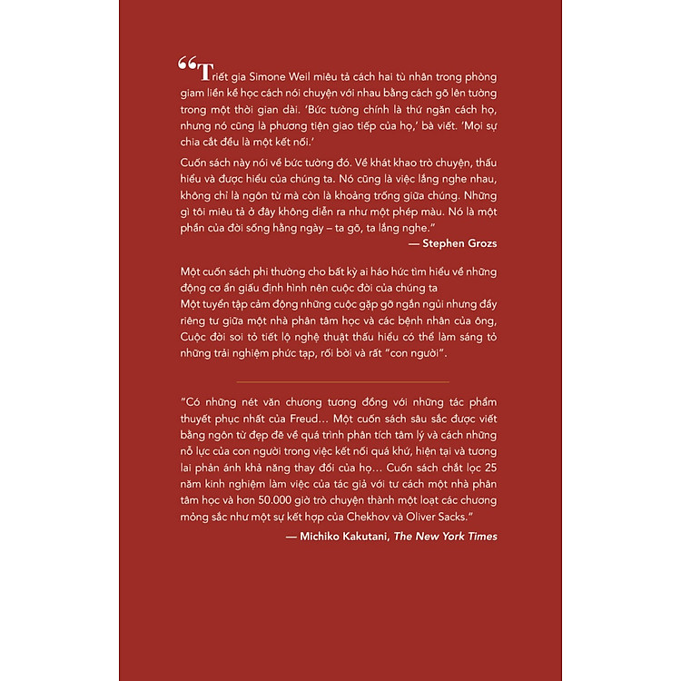 Mua tại TiktokMột cuốn sách phi thường cho bất kỳ ai háo hức tìm hiểu về những động lực ẩn giấu định hình nên cuộc sống của chúng ta Chúng ta đều là những người kể chuyện – chúng ta tạo nên những câu chuyện khiến cuộc sống của chúng ta ý nghĩa. Một tuyển tập cảm động những cuộc gặp gỡ ngắn ngủi nhưng đầy riêng tư giữa một nhà phân tâm học và các bệnh nhân của ông, "Cuộc đời soi tỏ" tiết lộ nghệ thuật thấu hiểu có thể soi tỏ những trải nghiệm phức tạp, rối bời và rất “con người”. Và trên hết, những câu chuyện này chỉ cho chúng ta không chỉ cách để yêu bản thân mà còn cả cách để tìm thấy bản thân .