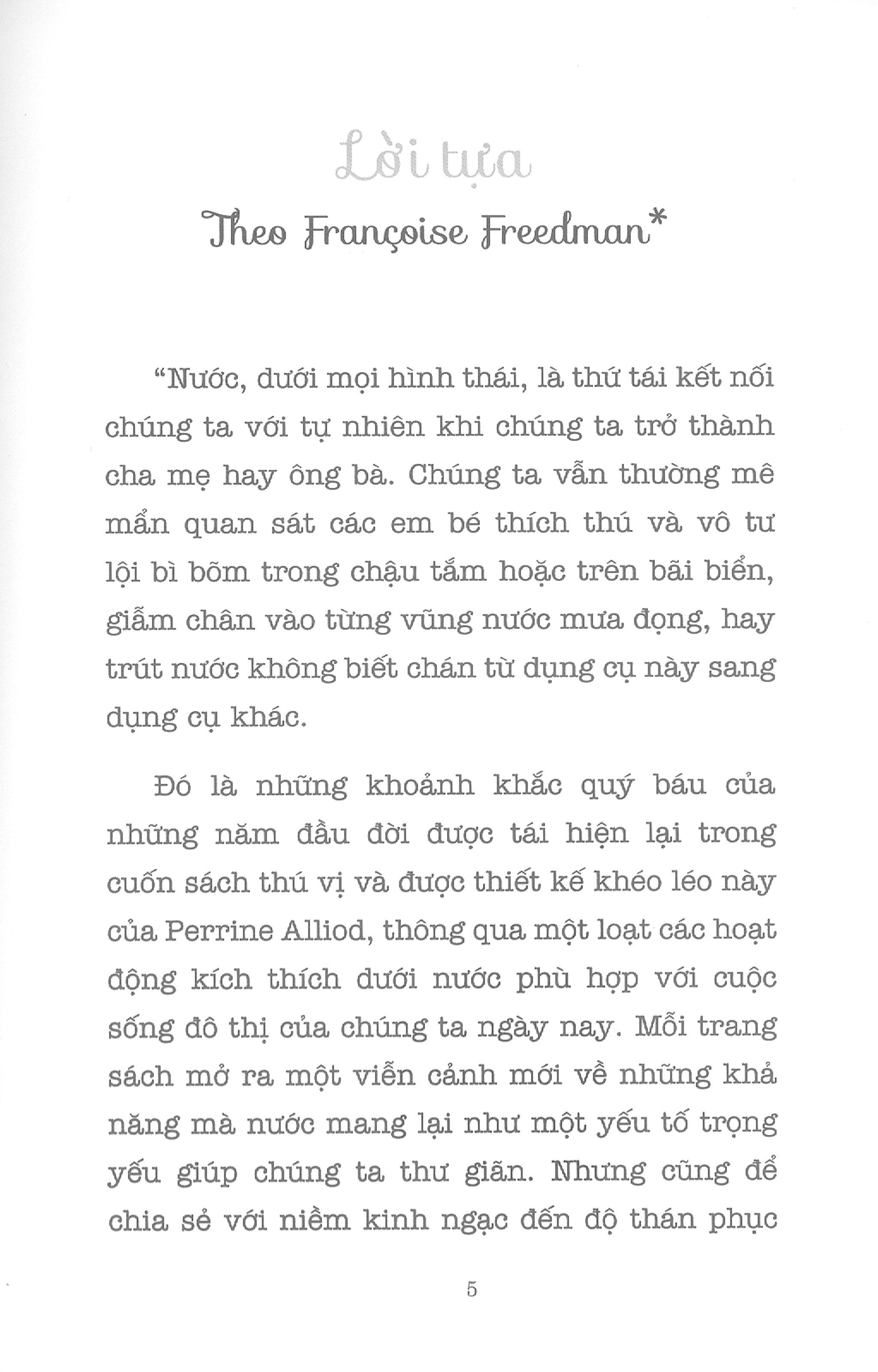 Giới thiệu các hoạt động với nước cho con chính là mở ra cho con một phạm vi trải nghiệm và khám phá đặc biệt phong phú và rộng lớn. Nhờ vào những tính chất vật lý mà nó sở hữu, môi trường nước mang lại cho trẻ những trải nghiệm vận động và kích thích các giác quan ngay từ khi còn rất nhỏ.