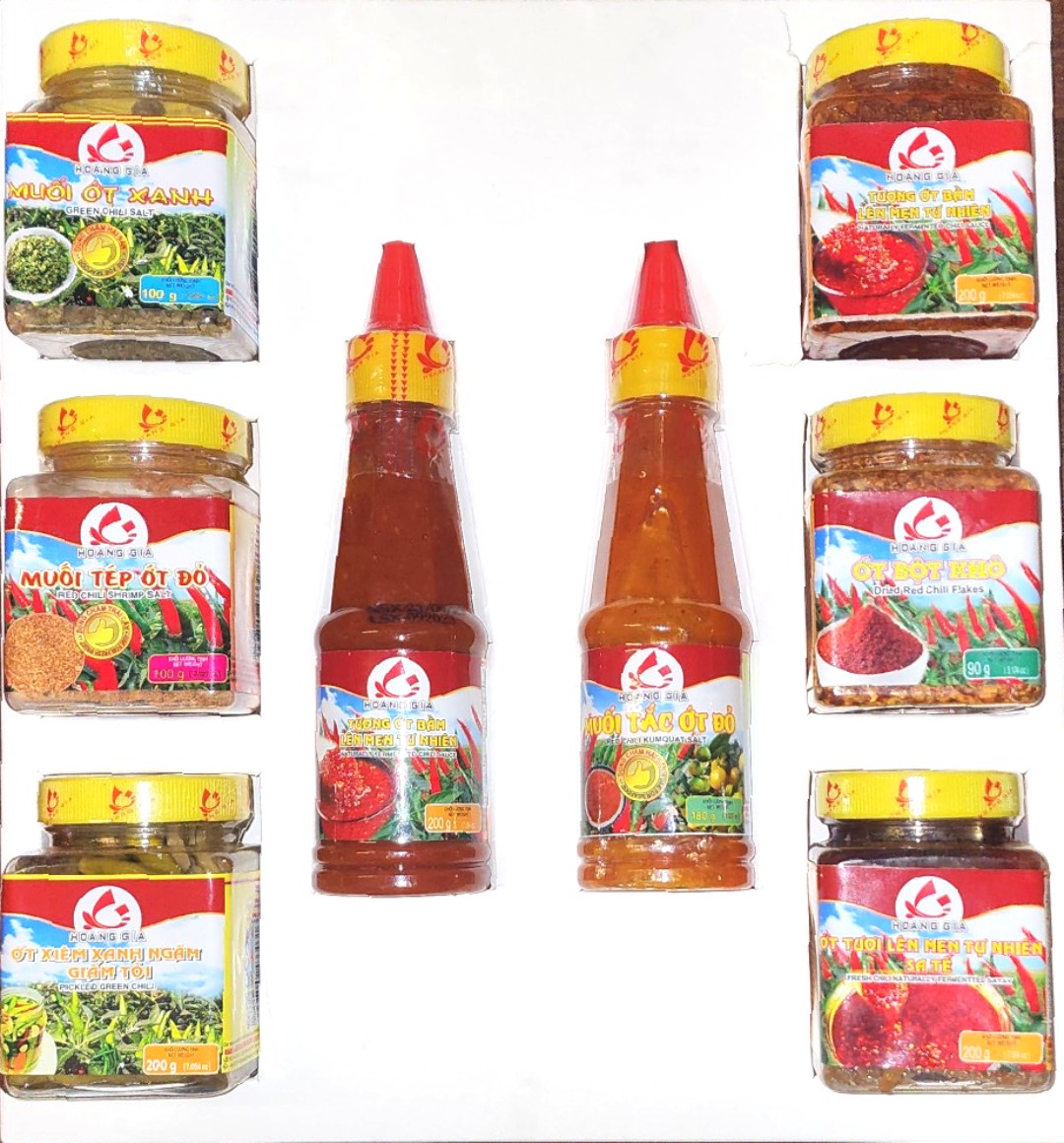 Bộ gia vị ớt Hoàng Gia bao gồm: - Ớt xiêm xanh ngâm giấm tỏi - 200g - Muối tép ớt đỏ - 100g - Muối ớt xanh - 100g - Tương ớt bằm lên