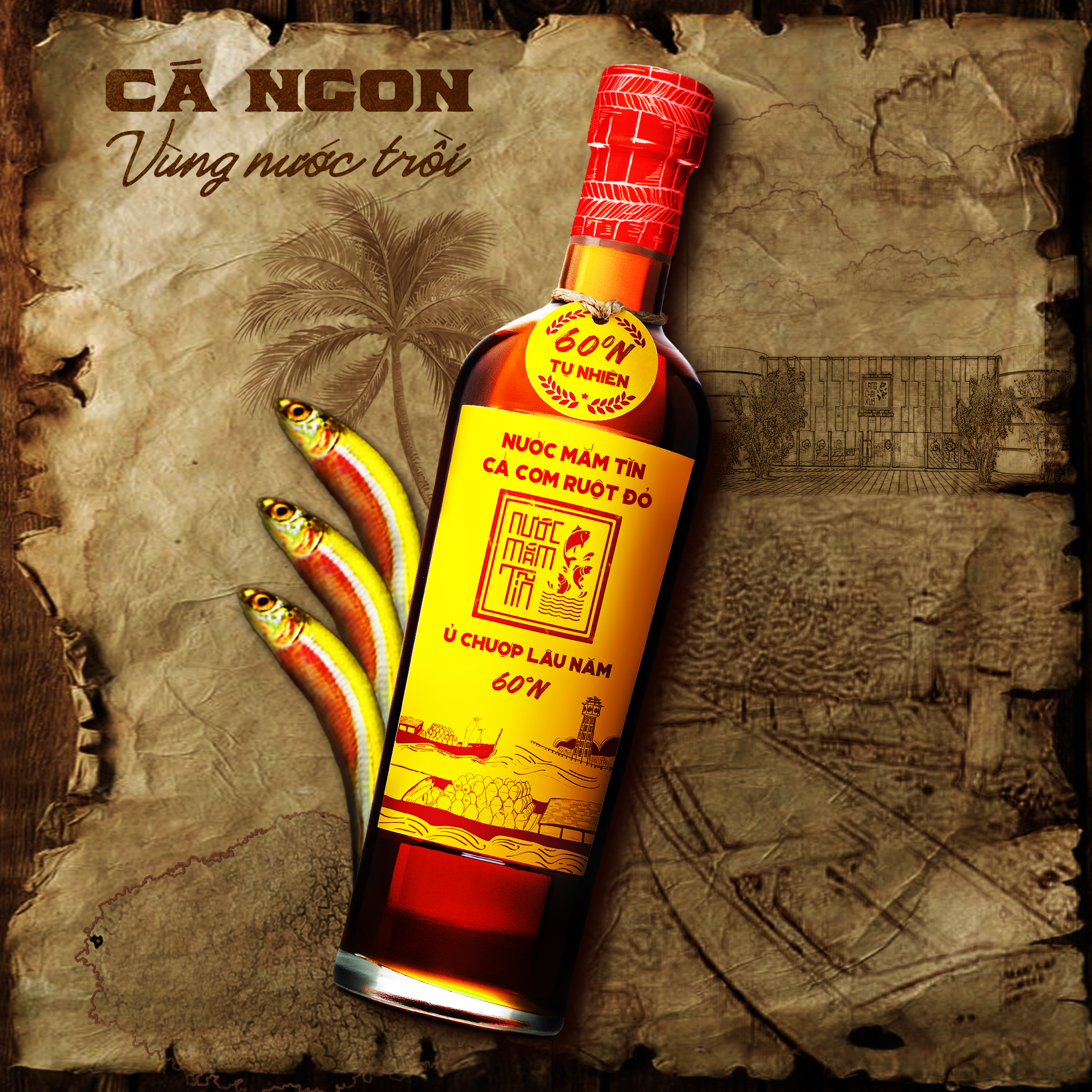 - Nước mắm cá cơm 60N độ đạm được ủ chượp bằng cá cơm vàng ruột đỏ quý hiếm gần 36 tháng theo công thức 300 năm của bảo tàng nước mắm Làng Chài Xưa