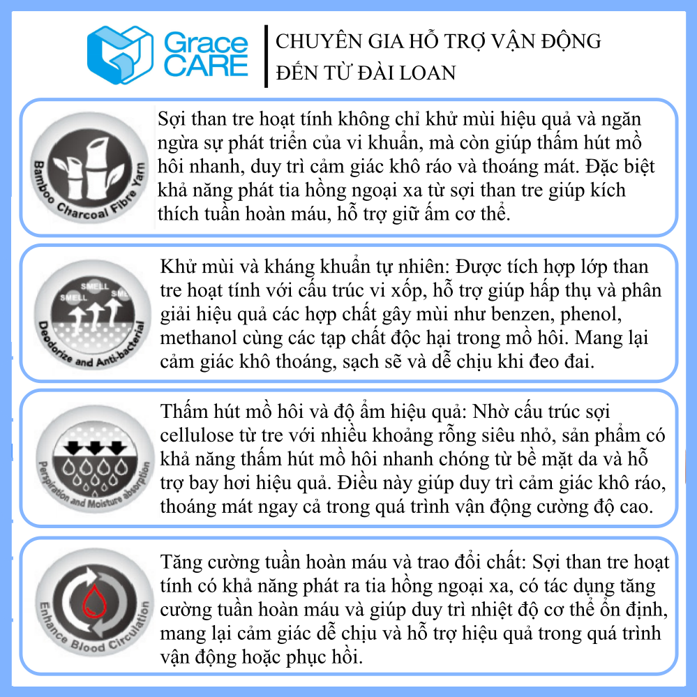 Thương hiệu: Grace Care - Nhà cung cấp chuyên nghiệp các sản phẩm chỉnh hình, bảo hộ thể thao tại Đài Loan. Sản xuất: Đài Loan Sản phẩm đạt tiêu chuẩn y tế ISO 13485 Đơn vị bán: Cái Size: S / M / L / XL Chất liệu: Polyester, Cotton, Bamboo Charcoal Sợi than tre, Rubber, Nylon, Polypropylene,
