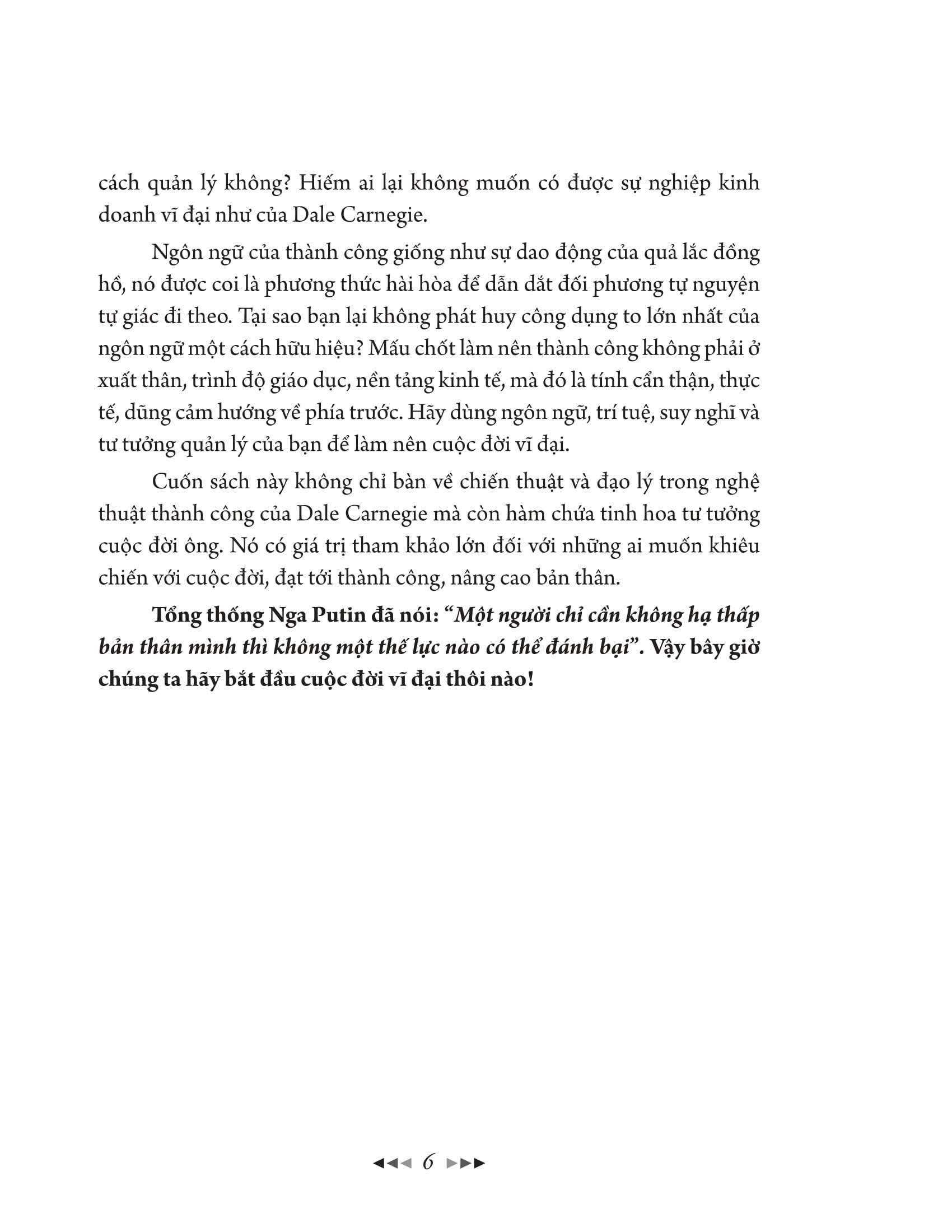 Dale Carnegie - Bậc Thầy Của Nghệ Thuật Giao Tiếp Dale Carnegie là bậc thầy nhân sinh vĩ đại của thế kỷ XX. Nửa thế kỷ trở lại đây, danh tiếng của ông ngày càng được nhiều người biết đến. Từ phương Tây sang phương Đông, các tác phẩm của Dale Carnegie được dịch ra mười thứ tiếng, gần như bất kỳ ngữ hệ nào cũng có những bản dịch sách của ông. Vì thế ông được coi là tác giả có lượng sách bán chạy lớn thứ hai trong lịch sử xuất bản nhân loại. Tờ Time của Mỹ từng viết: “Có lẽ ngoài Nữ thần Tự do, ông chính là biểu tượng của nước Mỹ”. Từ một đứa trẻ nông thôn trở thành một danh nhân nổi tiếng thế giới, dựa vào đâu mà được như vậy? Đó là vấn đề khiến nhiều người suy nghĩ. Cho dù “Thất bại là mẹ thành công”, nhưng ai chẳng hy vọng tìm ra bí quyết thành công để có thể thuận lợi đoạt được vòng nguyệt quế? Thành công của Carnegie được lý giải là dựa vào việc ông có cách đối nhân xử thế sâu sắc hơn người, trí tuệ vượt bậc; tư tưởng quản lý bất hủ, mẫn tiệp nhanh nhạy; nghệ thuật ngôn ngữ giao tiếp phong phú, hàm súc. Dựa vào thành công và tư tưởng của ông, chúng ta có thể chắt lọc được tinh hoa trong đó. Suy nghĩ một cách sâu sắc, chúng ta sẽ thấy được phong thái và trí tuệ của bậc thầy nhân sinh, vị thần trí tuệ, kỳ tài kinh doanh, bậc thầy ngôn ngữ này, để từ đó có thể lĩnh hội được nghệ thuật thành công bất hủ của ông. Tin rằng điều này chắc chắn rất có ích đối với bạn. Dale Carnegie là một cao thủ trong kinh doanh. Trên đời, điều con người khó lý giải nhất chính là “đứng soi gương nhưng lại nhìn thấy kẻ trong gương không phải m.ình mà là một người khác”. Bạn có nhận ra bản thân m.ình không? Bạn có nhân sinh quan của riêng m.ình không? Bạn có thể tạo lập và sống cuộc đời tự chủ không? Trong cuộc sống có quá nhiều điều không được như ý, có khi những bất hạnh sẽ phát sinh ở xung quanh, thậm chí là giáng xuống đầu bạn. Có lẽ bạn sẽ cảm thấy m.ình nản lòng thoái chí, sống không có mục đích. Dale Carnegie chính là vị cứu tinh, người dẫn dắt cho những người gặp khó khăn, thất bại. Carnegie đã tiếp cận cuộc sống với cái nhìn tinh tế và sâu rộng về mọi mặt, tiến hành thay đổi ngay trong quá trình sinh tồn, trưởng thành và phát triển để hạn chế bớt những sự việc đáng tiếc của nhân loại. Tư tưởng của Dale Carnegie giúp ta nhận ra và vượt qua chính m.ình. Dale Carnegie là một vị thần trí tuệ. Tuy không bàn về vũ trụ rộng lớn vĩ đại nhưng ông biết gợi mở trí tuệ của m.ình và người khác, tư tưởng của ông chính là một cẩm nang về trí tuệ. Con người học tập và làm việc trong cuộc sống này luôn thể hiện và vận dụng trí tuệ nhưng nhiều khi lại không chú tâm, thậm chí có thể cảm thấy lực bất tòng tâm. Carnegie nhận ra tiềm năng của con người là không giới hạn, mấu chốt là phải biết cách gợi mở và vận dụng nó. Ông đã đưa ra chính những biểu hiện về trí tuệ trong cách cư xử, sinh hoạt và làm việc thường ngày của m.ình để giải thích một cách toàn diện nhất về điều này cho người đời sau. Dale Carnegie là một kỳ tài trong quản lý kinh doanh. Quan niệm của ông về quản lý được cả thế giới công nhận. Những tư tưởng của ông về tự quản lý, quản lý công khai, quản lý tiêu thụ, cách dùng người đều được coi là xuất sắc. Những kinh nghiệm quản lý phong phú tích lũy trong cuộc sống sinh nhai cả đời ông chính là lời giáo huấn đáng để chúng ta tham khảo, mở ra cánh cửa rộng lớn trên con đường bước vào sự nghiệp kinh doanh. Nghệ thuật và tài năng kinh doanh xuất chúng của ông khiến mỗi một thành công đều khiến nhân loại hướng về. Dale Carnegie trở thành biểu tượng của chủ nghĩa hoàn mỹ trong giới quản lý trên thế giới, nhận được sự sùng bái và ngưỡng mộ của nhân loại. Dale Carnegie còn là một bậc thầy về ngôn ngữ. Trong thời đại internet hiện nay, phương thức quan hệ quốc tế biến đổi rất nhanh chóng, mỗi một cá nhân với xuất thân, tính cách, sở thích khác nhau, trong cuộc sống hay trên thương trường, chính trường đều cần có tài ăn nói và khả năng thuyết phụ Nhờ vậy mới có được sự coi trọng từ cấp trên và đồng nghiệp, sự yêu mến của cấp dưới, sự tin tưởng của khách hàng, có được tình yêu cũng như tình bạn tốt đẹp. Có thể diễn đạt một cách rõ ràng, ngắn gọn để thuyết phục người khác trong một thời gian ngắn hay không, đó chính là vấn đề mấu chốt dẫn tới thành công. Dòng sông lịch sử chảy cuồn cuộn, chôn vùi bao kẻ thành bại được mất với bao buồn vui, hoan lạc, bi thương. Nhiều kẻ đến tuổi xế chiều quay đầu nhìn lại không ngăn nổi tiếng thở dài “Nếu được sống thêm một lần, tôi tuyệt đối không lặp lại những thất bại đó”. Kỳ thực, thất bại và thành công nhiều khi chỉ cá