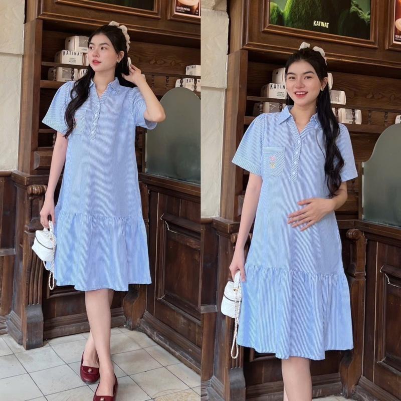 Mua tại Tiktok- THÔNG TIN SẢN PHẨM: • Đầm bầu công sở cổ sơ mi phối túi thêu phom đuôi cá dễ thương, trẻ trung. • Màu sắc: Xanh sọc, Hồng sọc, Đen, Xanh dương. • Chất vải: Cotton Hàn, Xốp Hàn. • Size: M (47 - 68Kg), L (67 - 80Kg). • Đầm thiết kế cài cúc 2 bên hông, có thể cài hoặc không cài tuỳ theo tháng thai. • Mom mặc thoải mái suốt thai kỳ và sau sinh luôn nha. • Em này diện đi làm, đi chơi, dạo phố đều xinh hết ý luôn ạ.