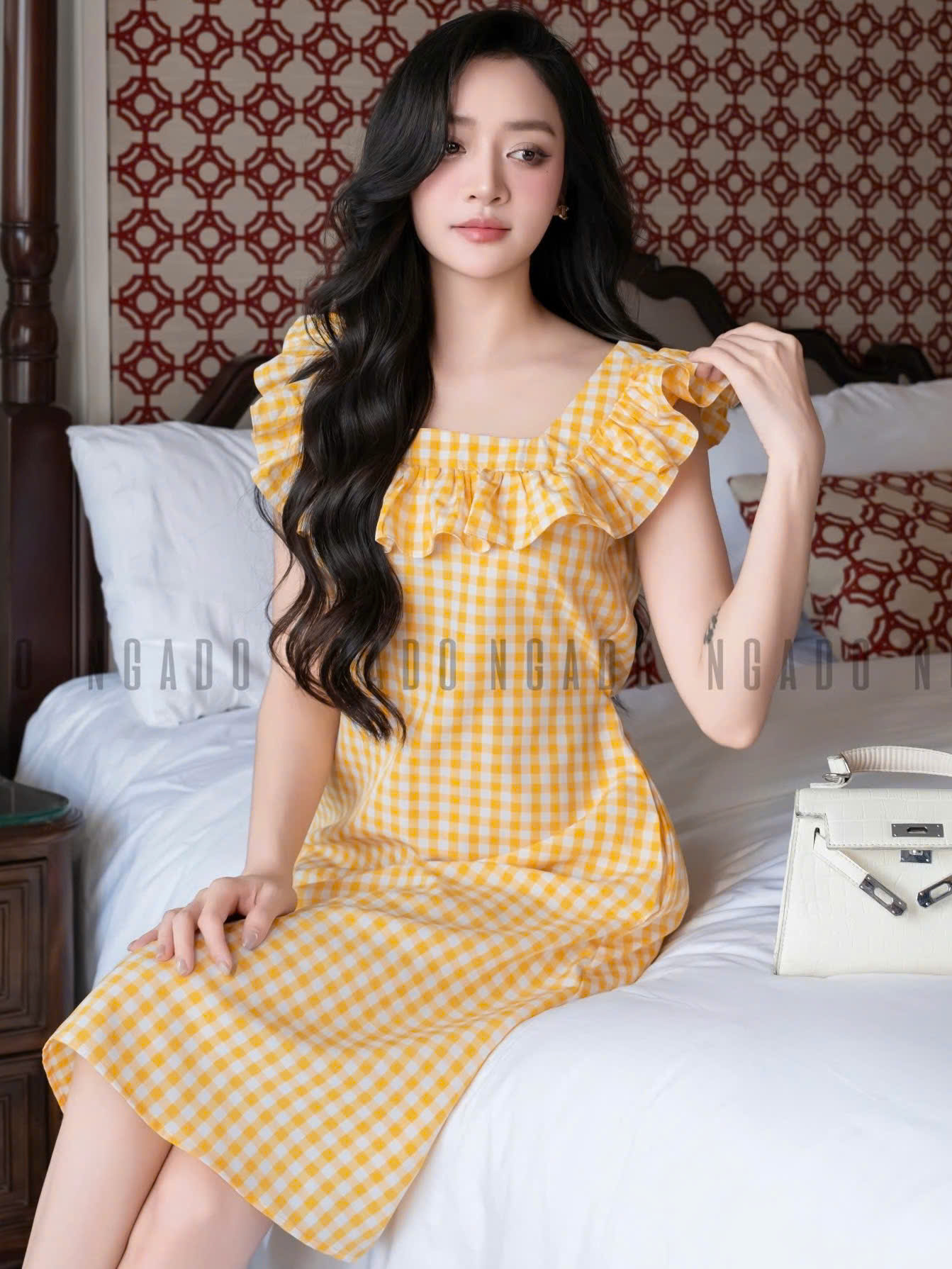 ✨Đầm caro vàng phối cổ nhún NGADO , đầm caro , đầm kẻ , đầm dạo phố