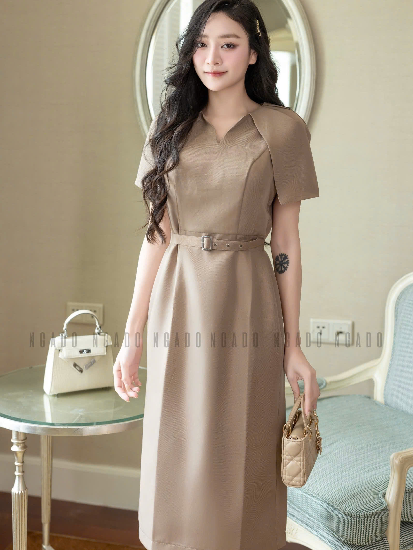 ✨Đầm nâu tay xếp ly NGADO , đầm công sở , đầm dự tiệc