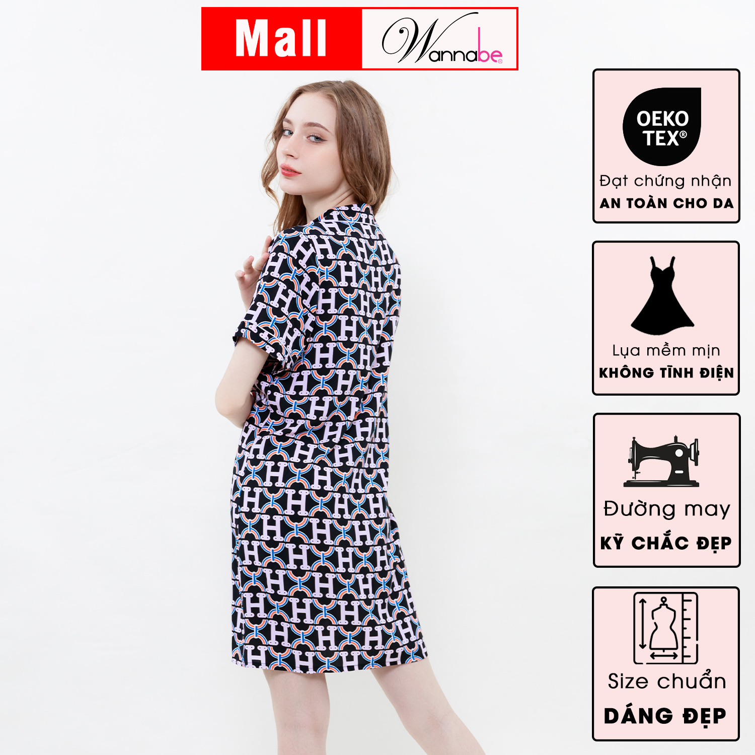 Đầm ngủ sơ mi lụa cao cấp Wannabe DNC19 thiết kế kiểu dáng pijama tay ngắn cùng hoạt tiết chữ H form rộng suông mang đến cảm giác thoải mái dễ chịu cho phái nữ khi mặc ở nhà